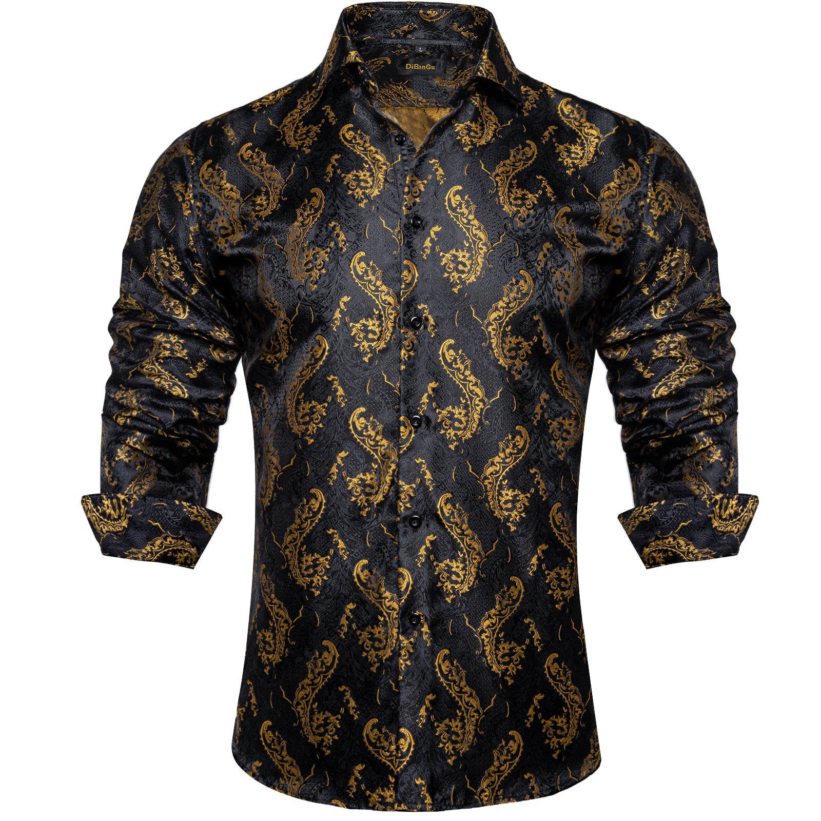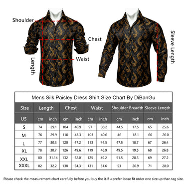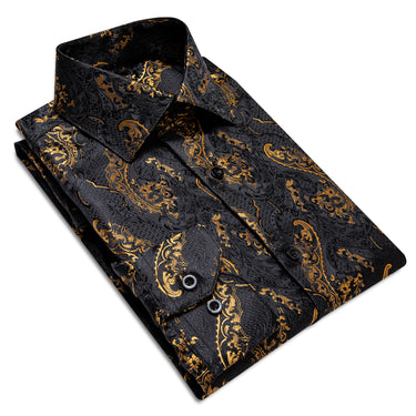 DiBanGu Black Golden Paisley Silk Men's Button Up Slim-Fit Shirt