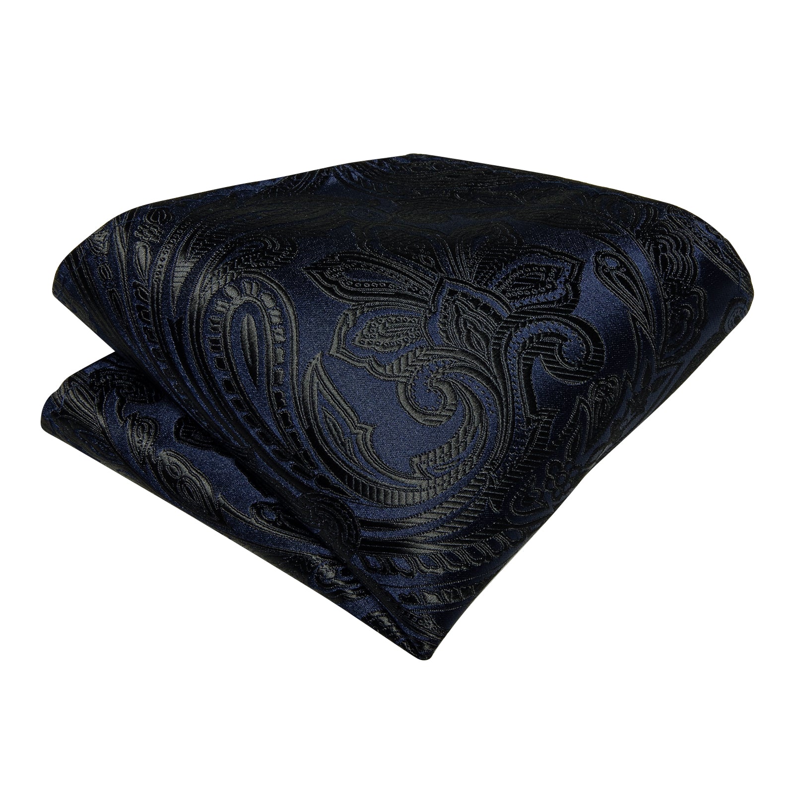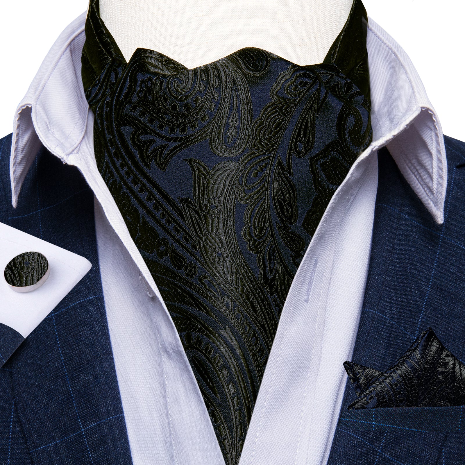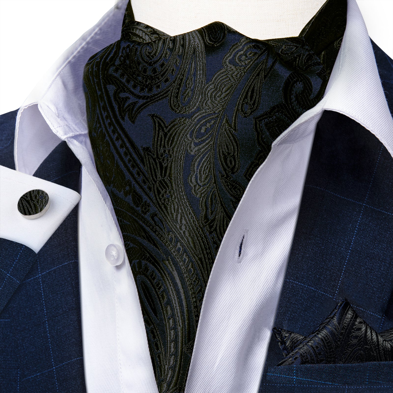 Black Floral Silk Cravat Woven Ascot Tie Pocket Square Handkerchief Suit Set