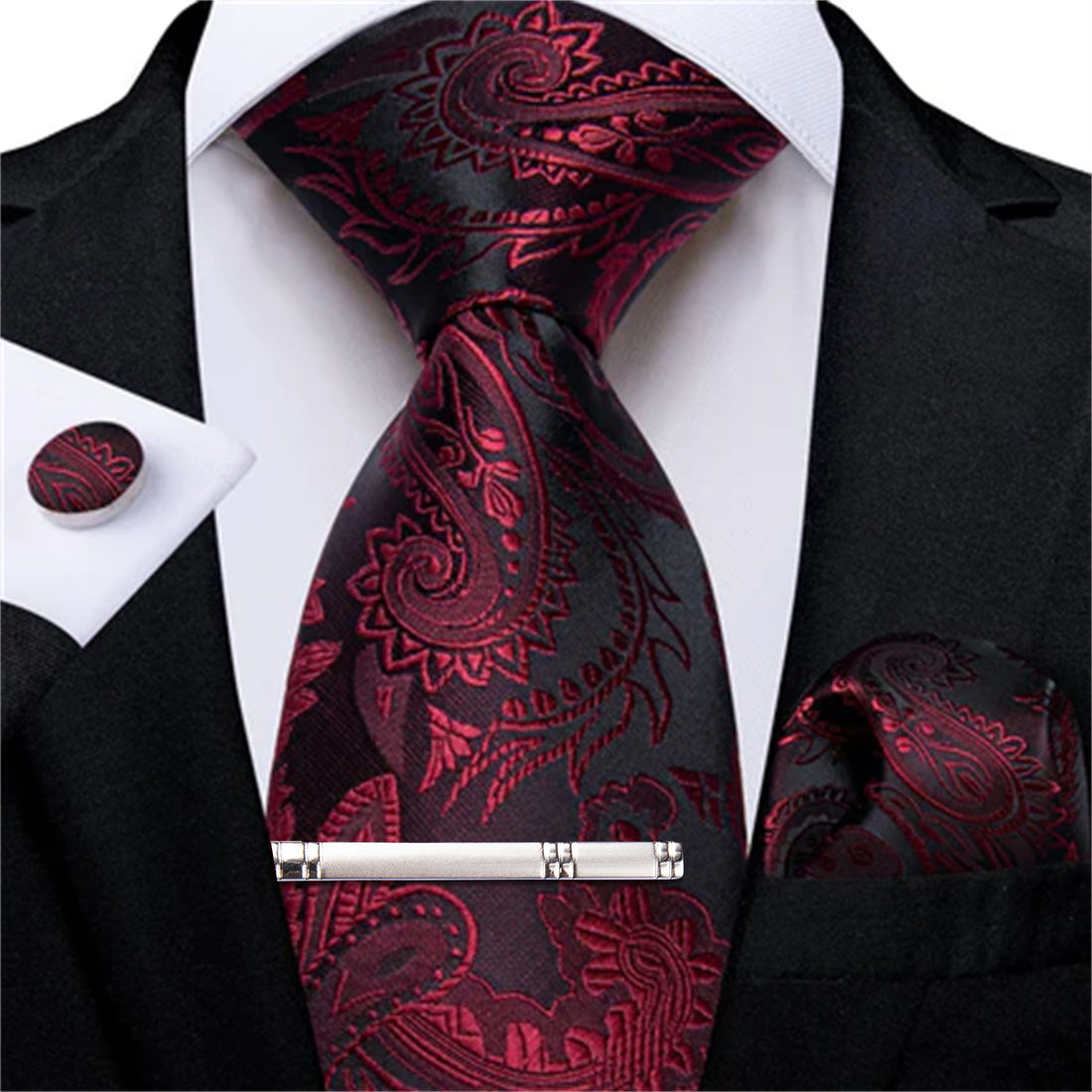 DiBanGu Dress Tie Red Paisley Men's Silk Tie Handkerchief Cufflinks Clip Set