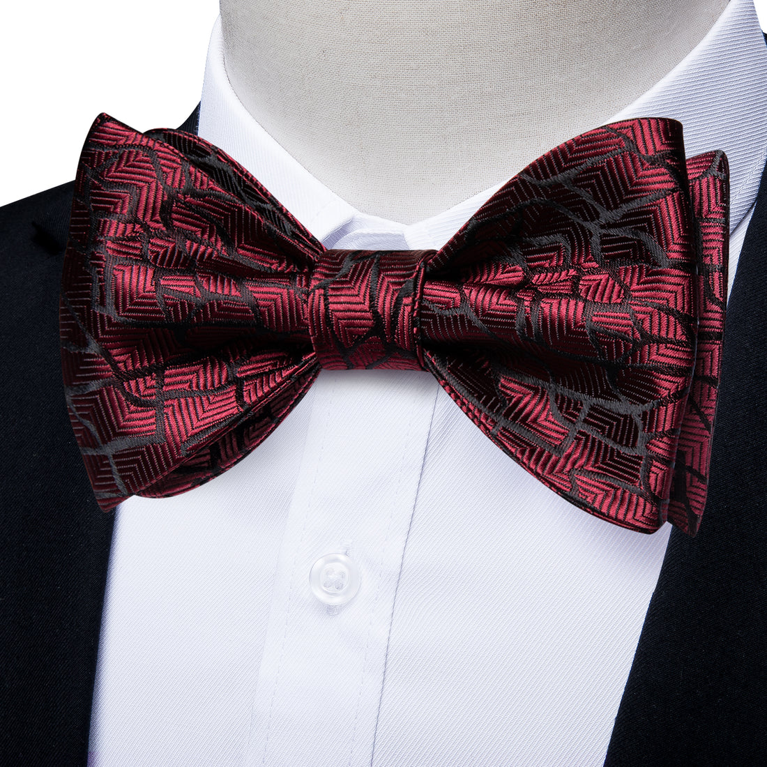 Red Black Floral Silk Bowtie Pocket Square Cufflinks Set