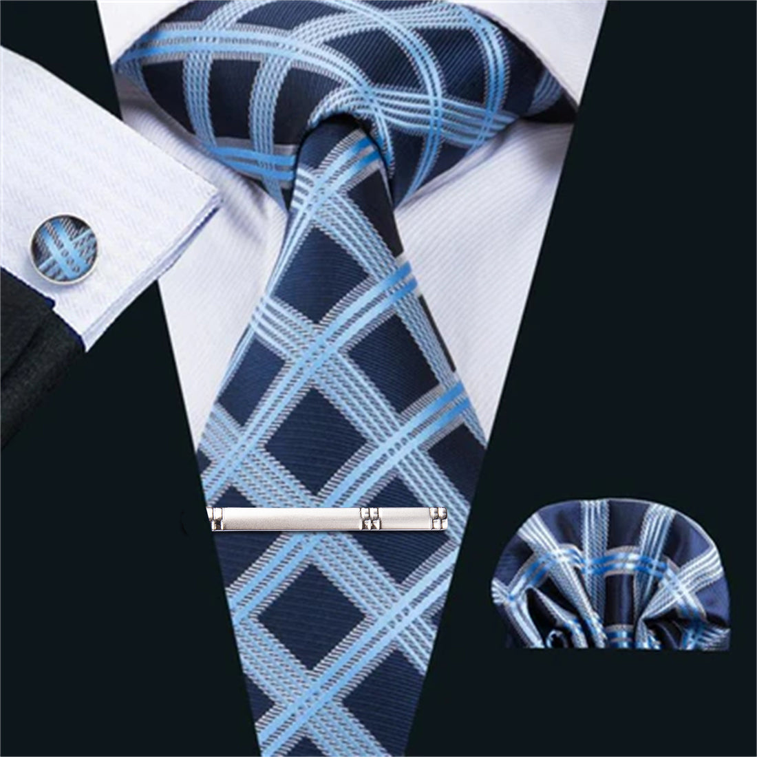 Blue Plaid Men's Tie Handkerchief Cufflinks Clip Set