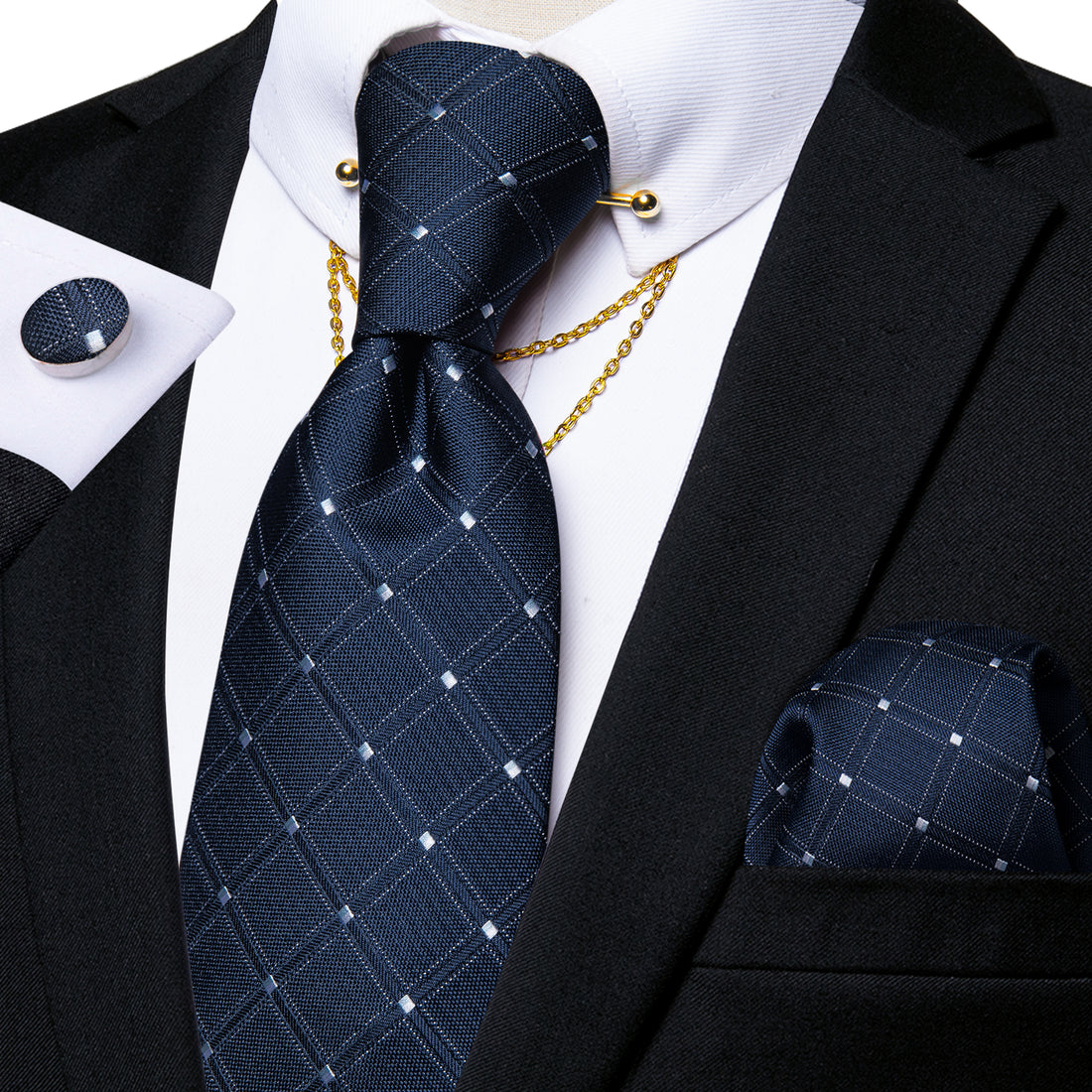 Blue Plaid Men's Tie Handkerchief Cufflinks with Collar Pin