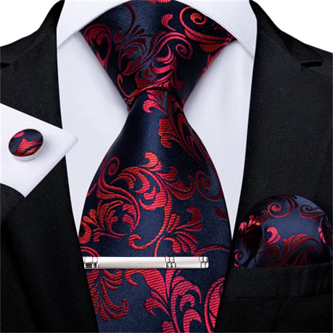 Blue Red Floral Men's Silk Tie Handkerchief Cufflinks Clip Set