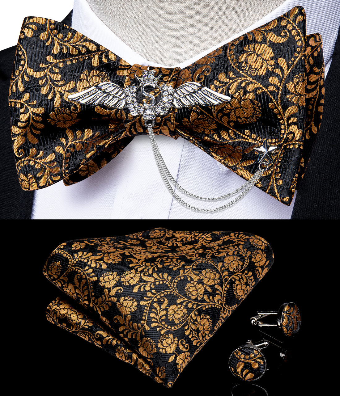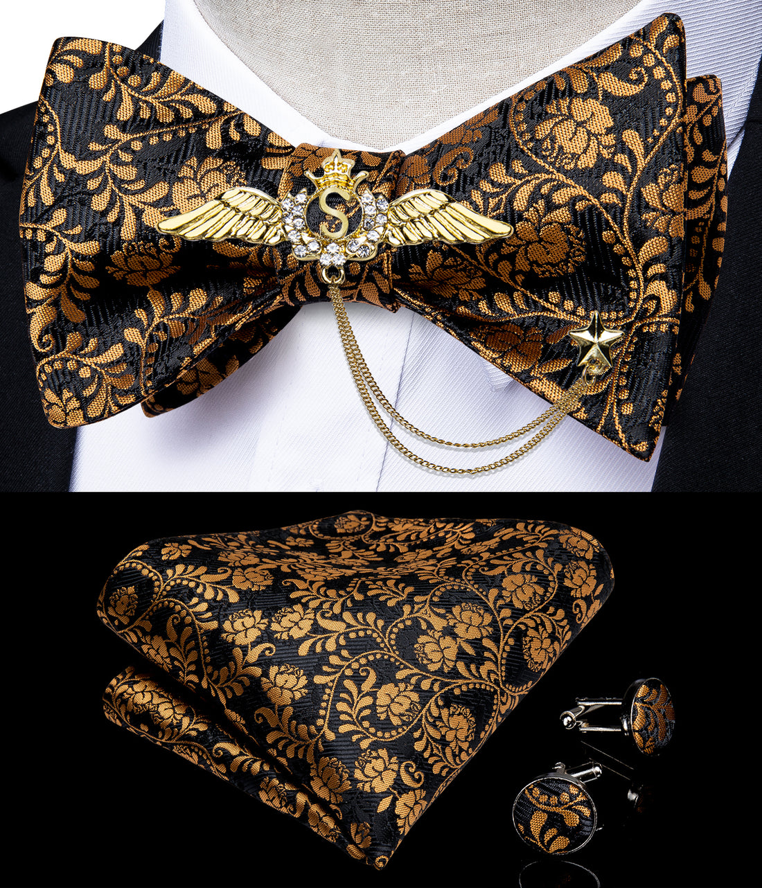 Black Gold Floral Self-Bowtie Pocket Square Cufflinks With Wing Lapel Pin Brooch