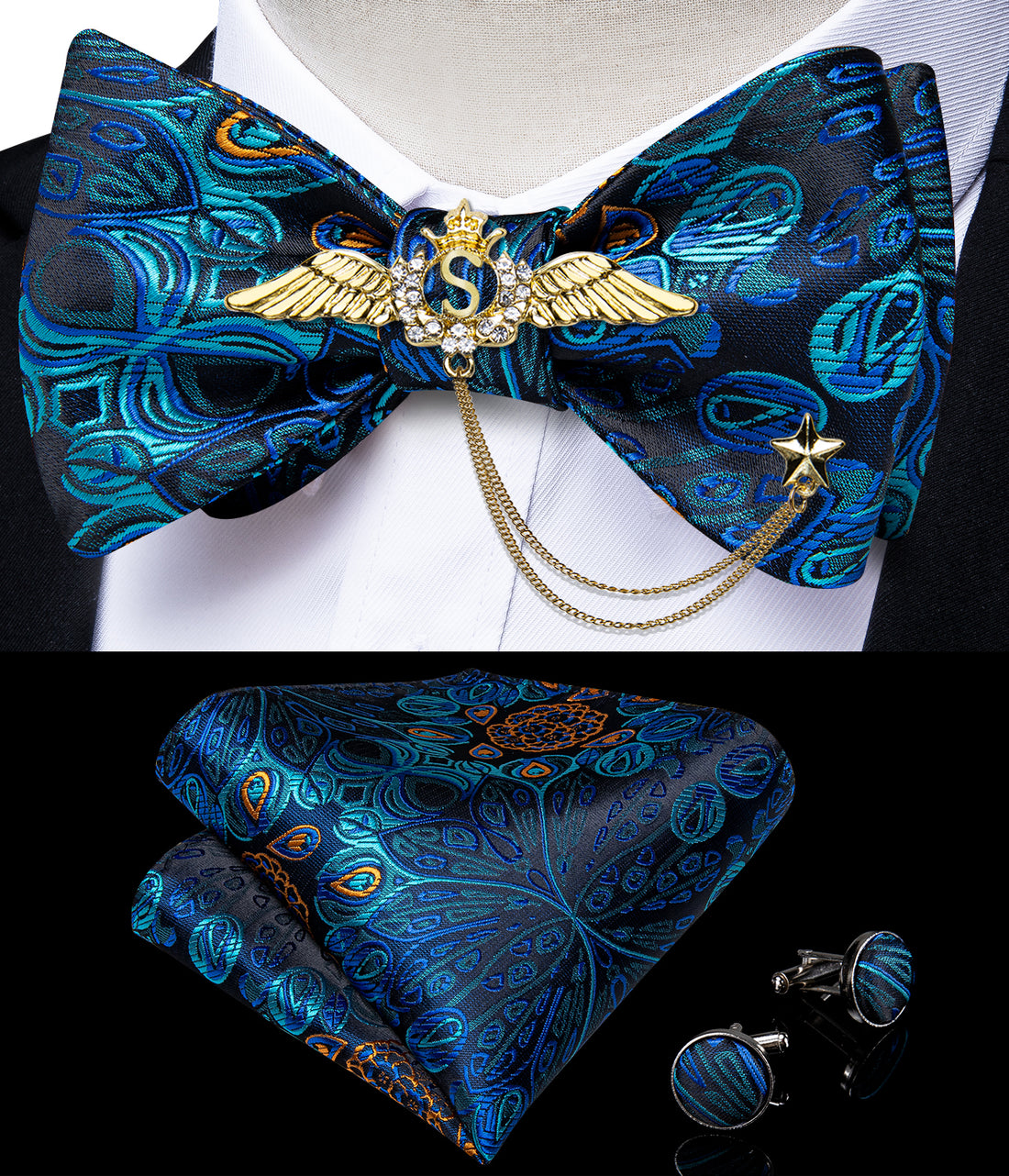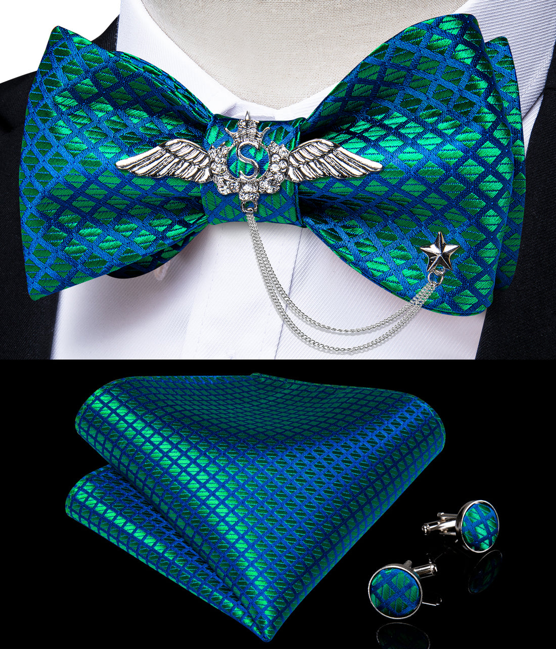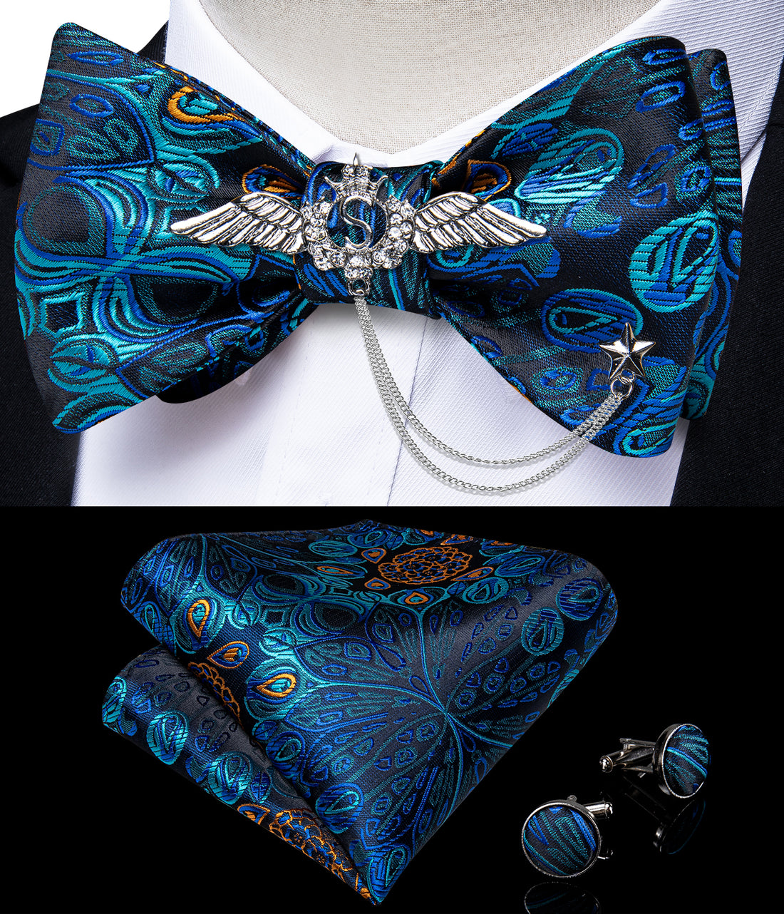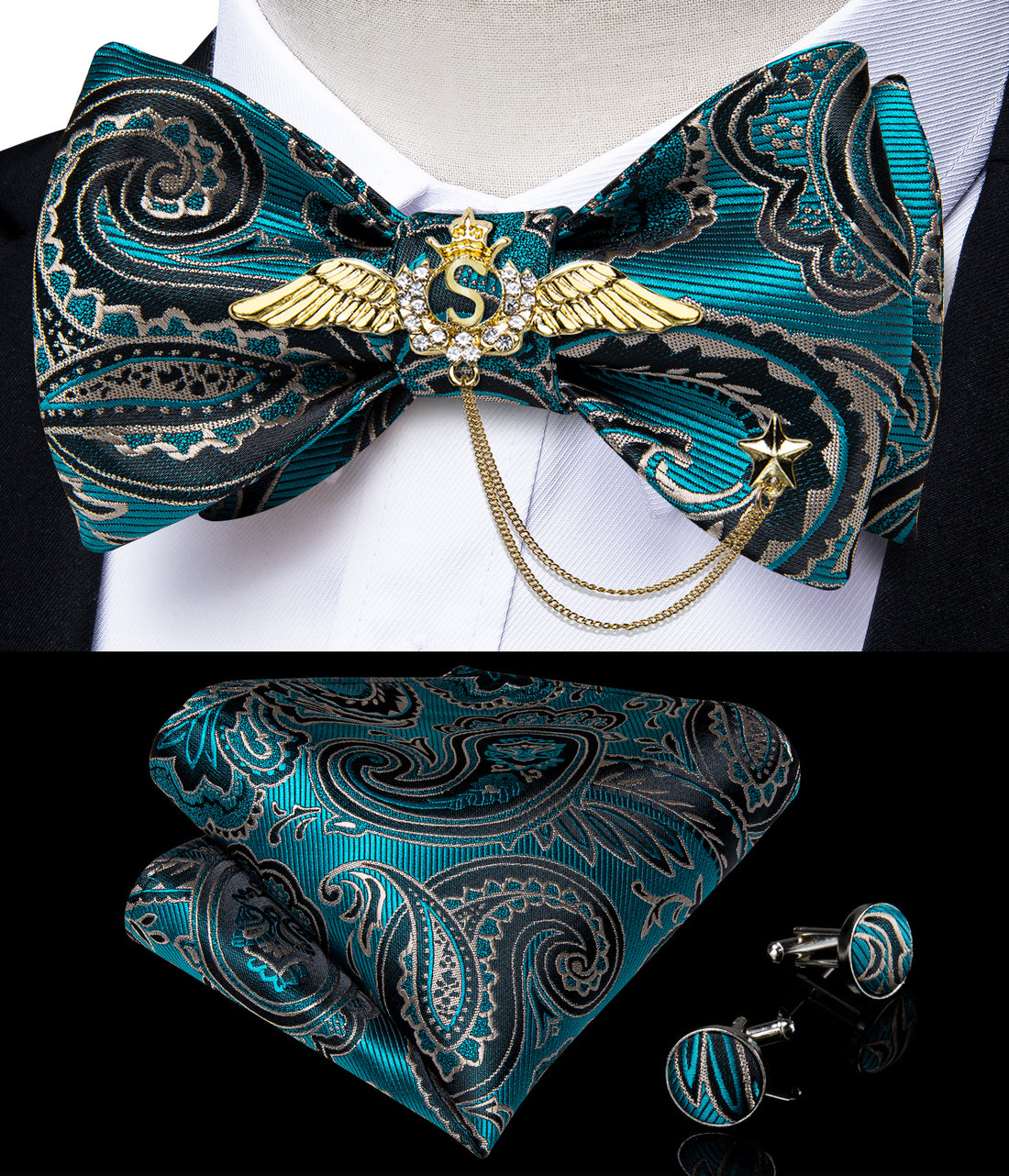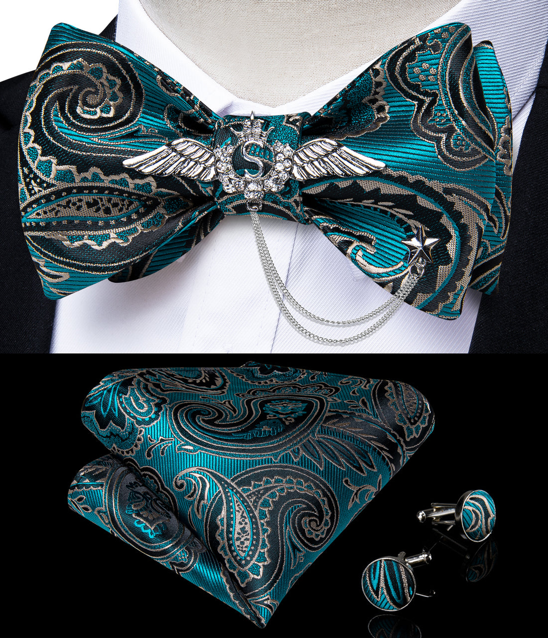 Blue Green Paisley Self-Bowtie Pocket Square Cufflinks With Wing Lapel Pin