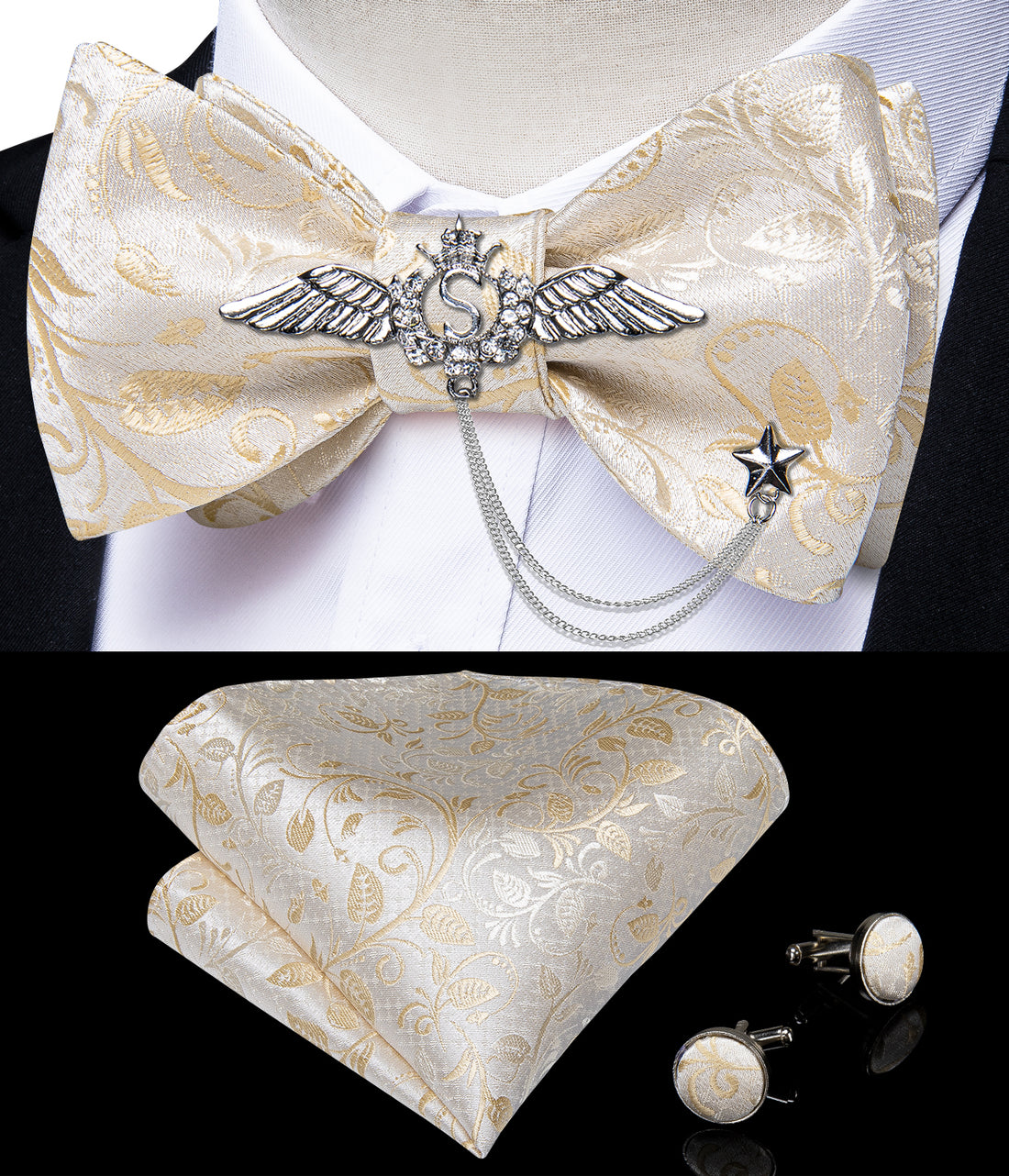 Beige Floral Self-Bowtie Pocket Square Cufflinks With Wing Lapel Pin
