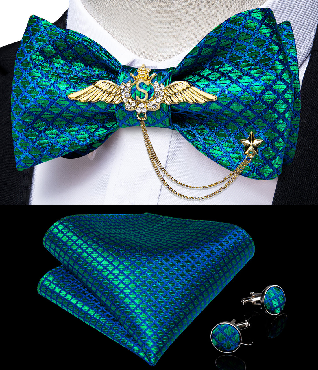 Blue Green Plaid Self-Bowtie Pocket Square Cufflinks With Wing Lapel Pin