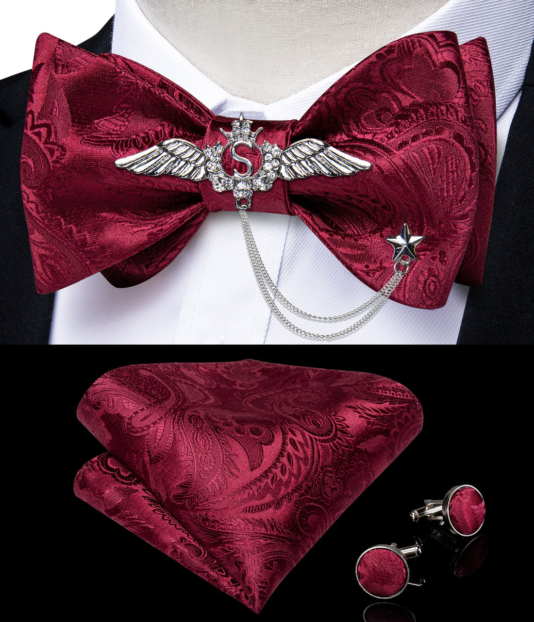 Red Paisley Self-Bowtie Pocket Square Cufflinks With Wing Lapel Pin
