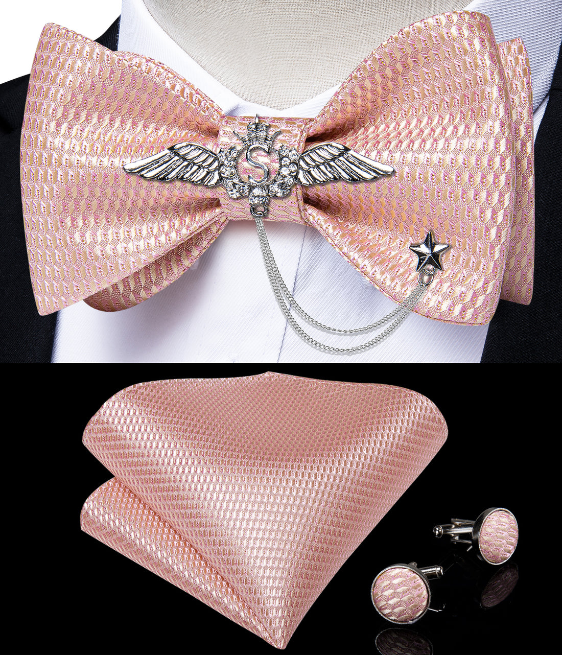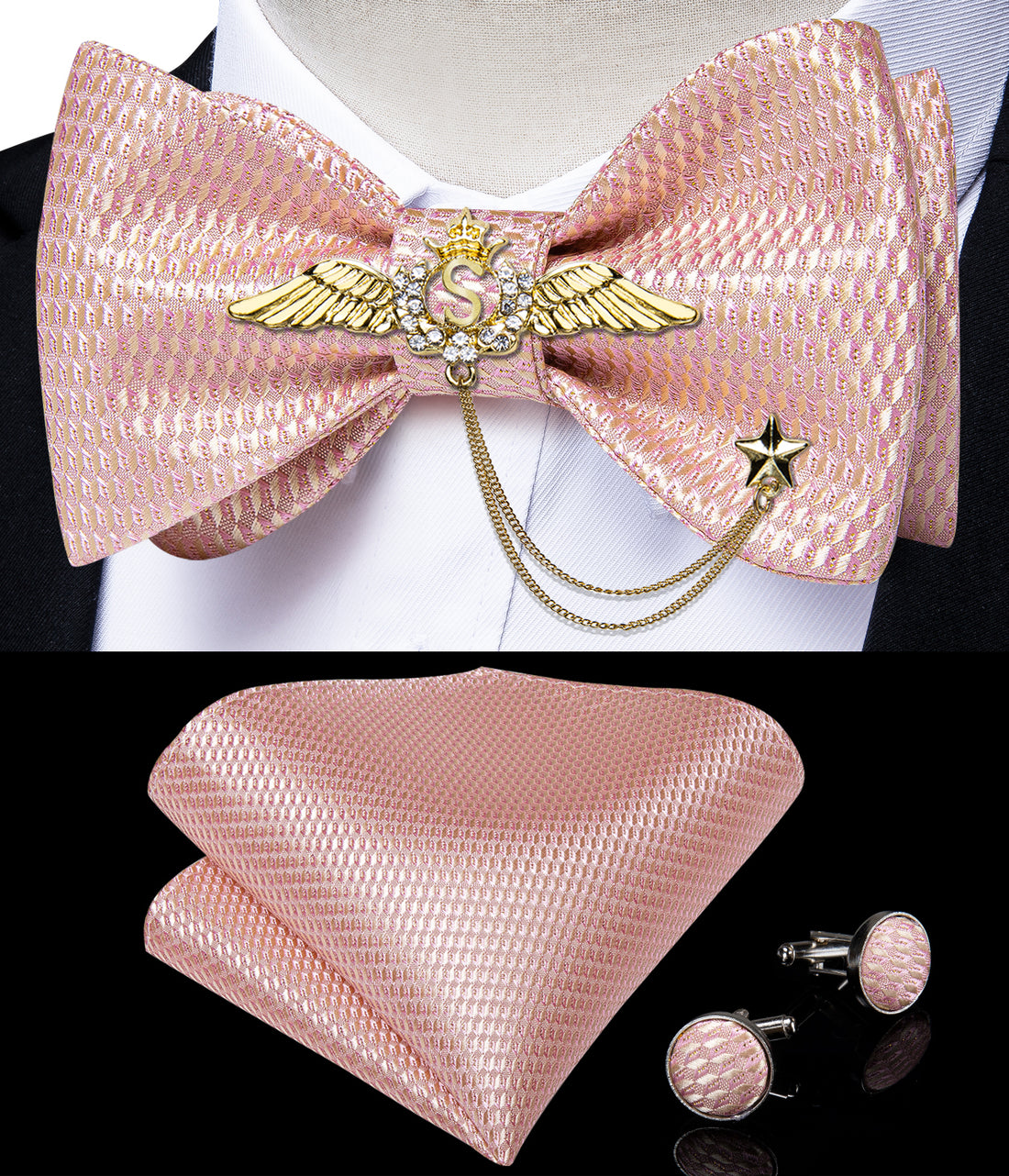 Pink Plaid Self-Bowtie Pocket Square Cufflinks With Wing Lapel Pin