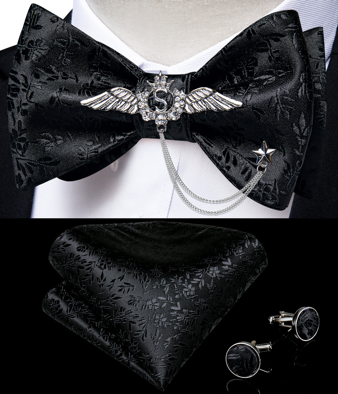 Black Floral Self-Bowtie Pocket Square Cufflinks With Wing Lapel Pin