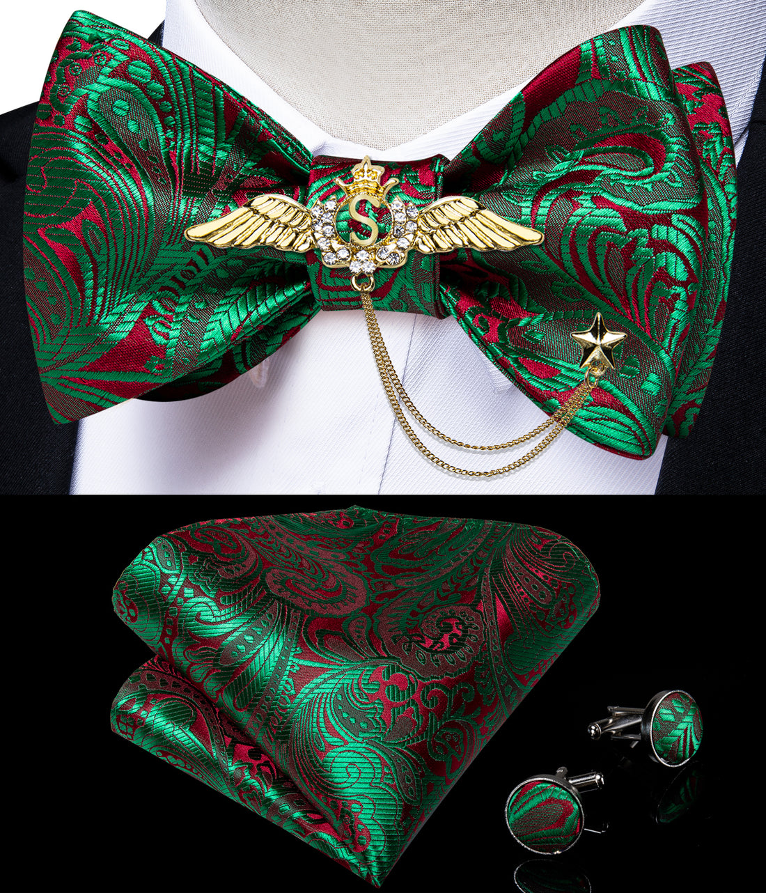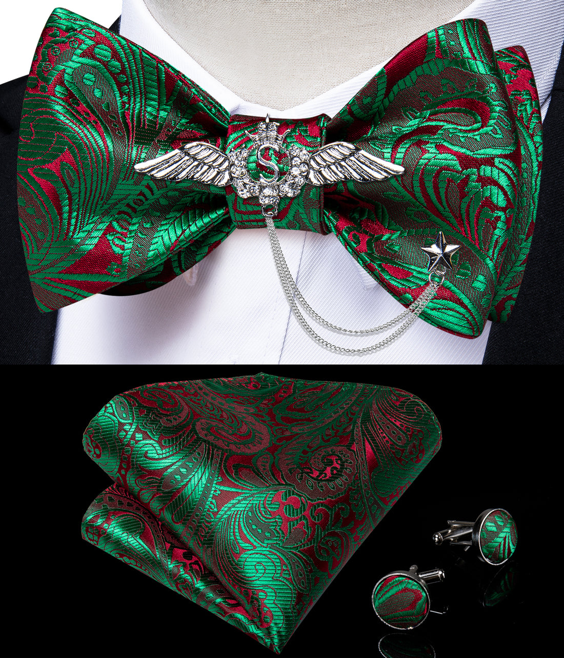 Green Red Floral Self-Bowtie Pocket Square Cufflinks With Wing Lapel Pin