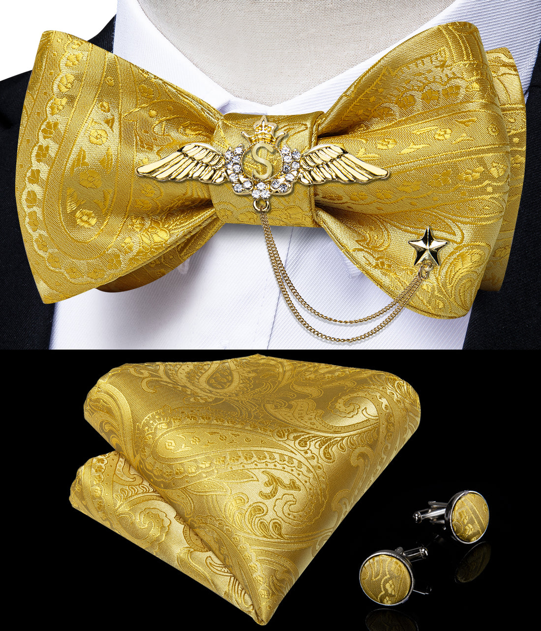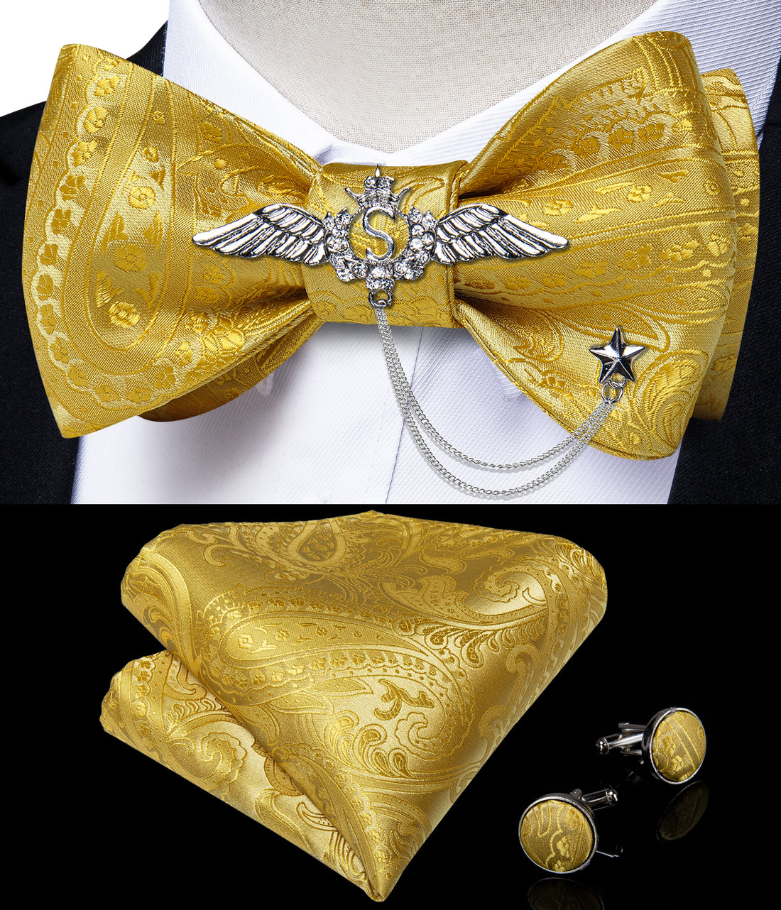 Yellow Paisley Self-Bowtie Pocket Square Cufflinks With Wing Lapel Pin