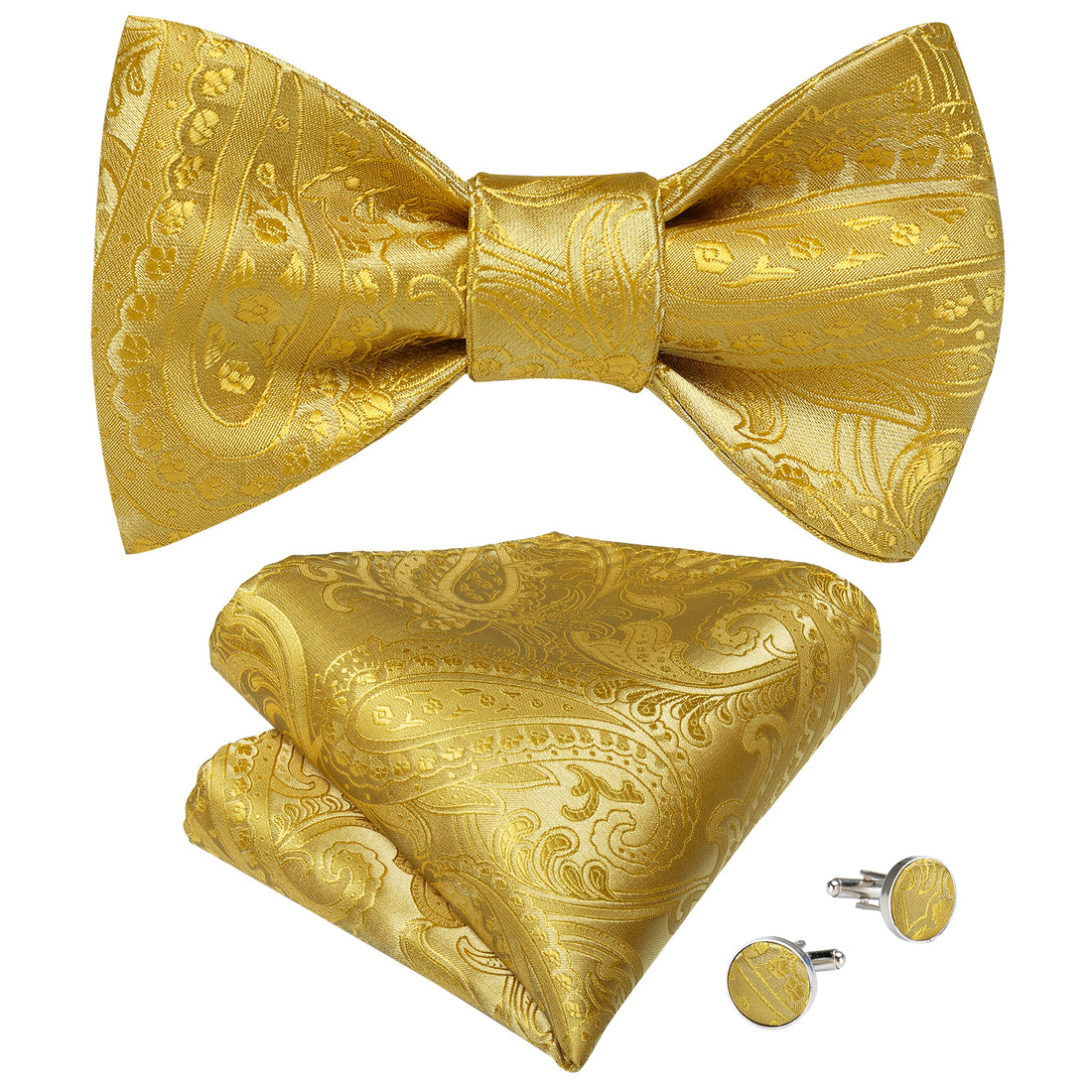 Yellow Paisley Self-Bowtie Pocket Square Cufflinks Set
