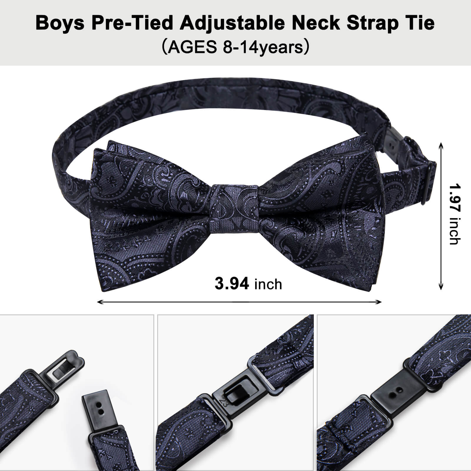【Classic Size】Tie size:2.55 inches Wide and 15 inches from Knot to Bottom , Pocket Square size: 7.87 x 7.87 inches. Pre-tied boy's bowtie is suitable for 8-14 -year-old boys