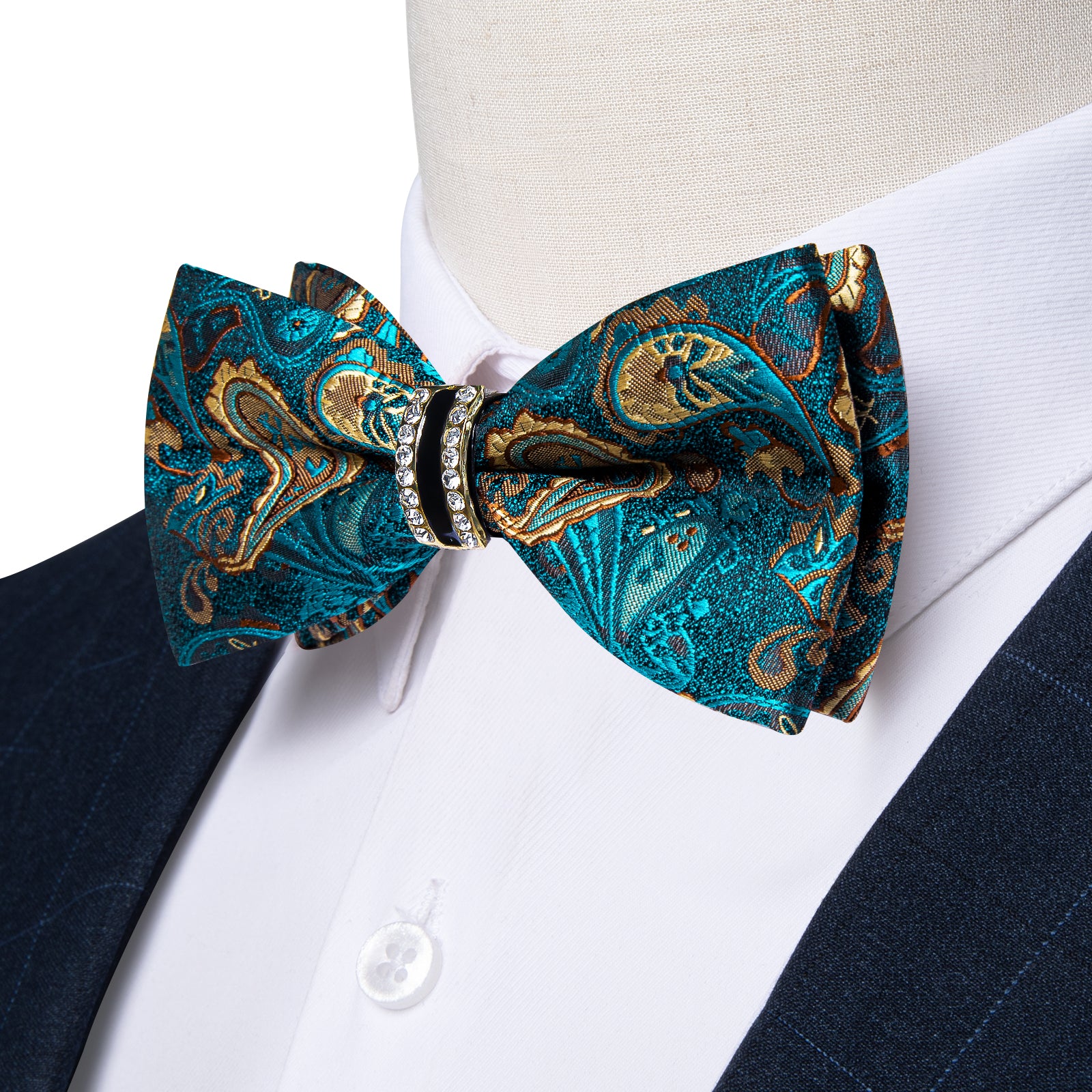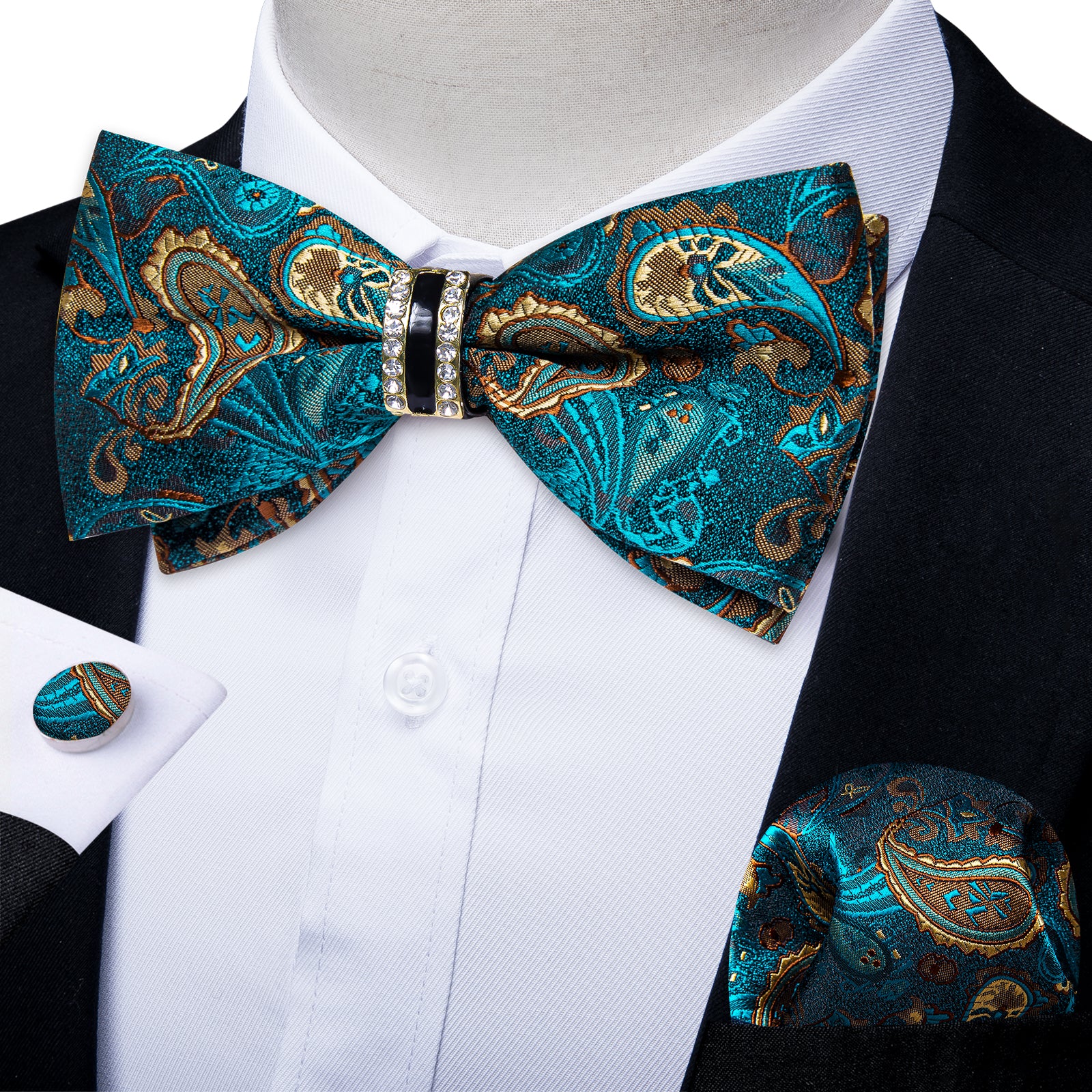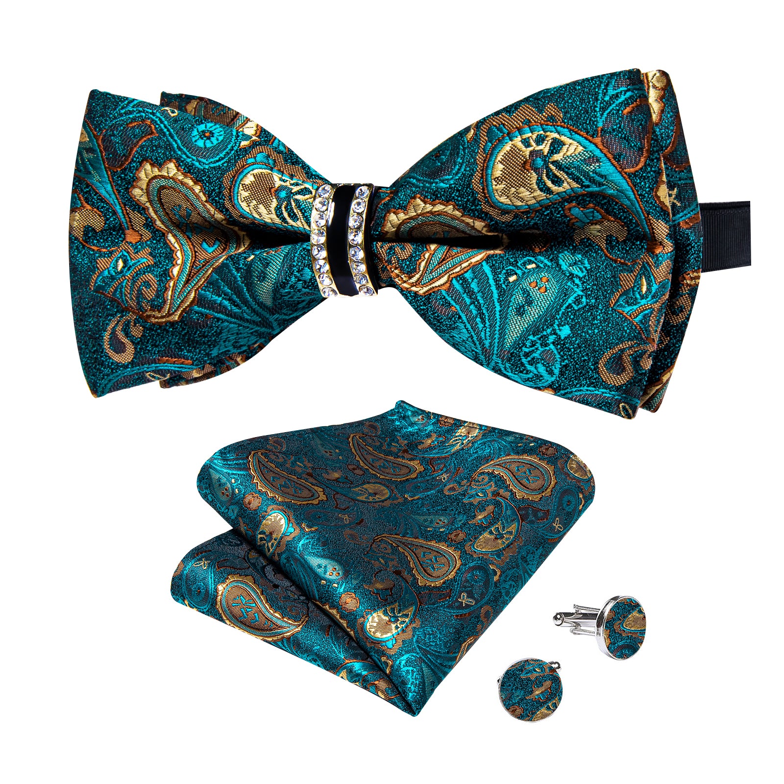 Green Brown Paisley Diamond Plastic Ring Men's Pre-Bowtie Pocket Square Cufflinks Set