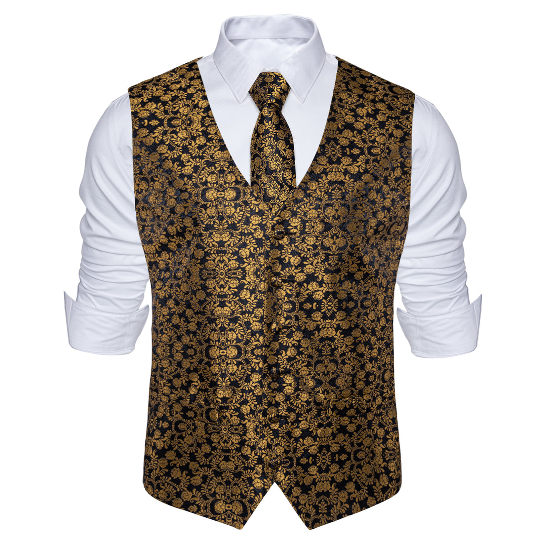 Fashion Gold Floral Jacquard Silk Waistcoat Vest Necktie Pocket Square Cufflinks Suit Set