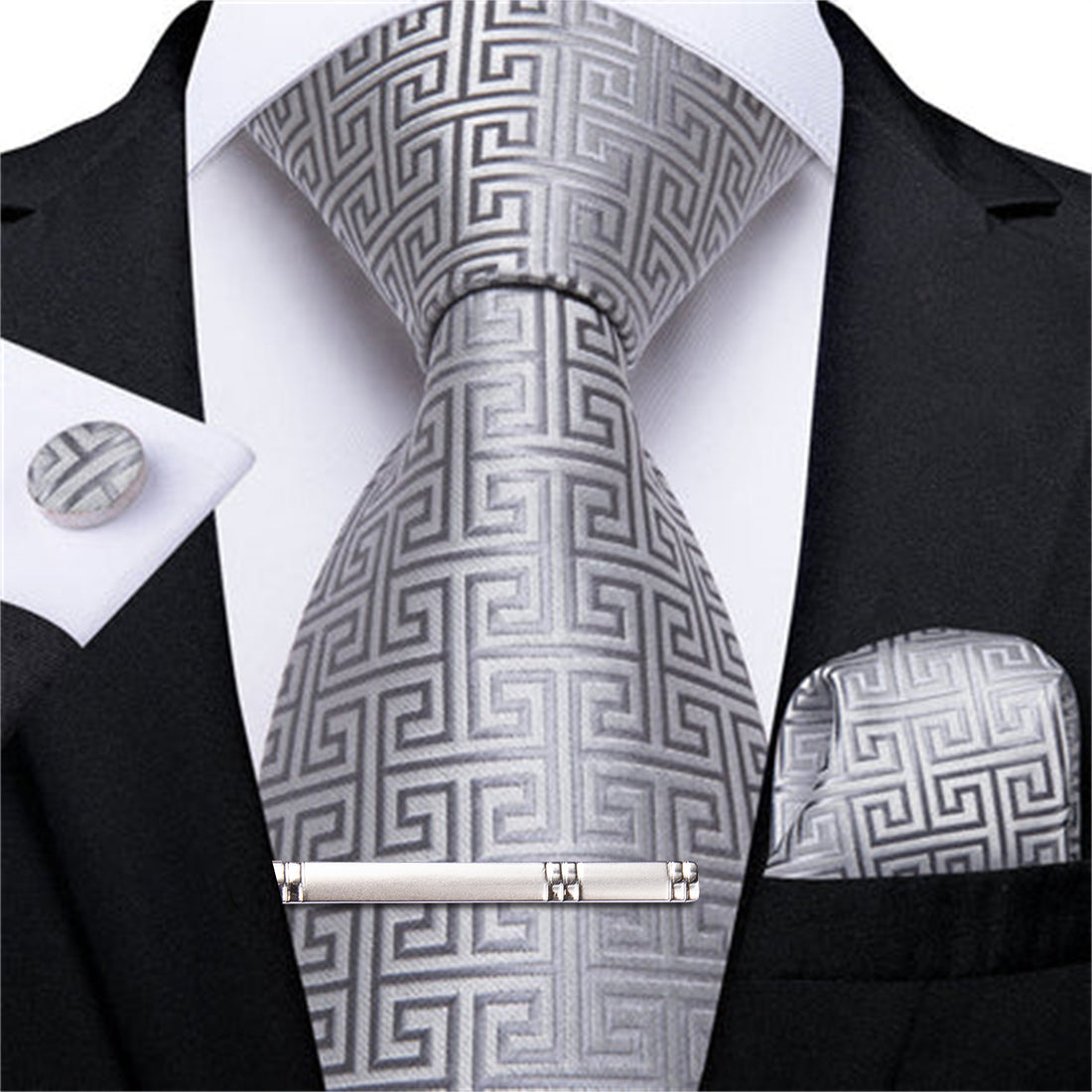 Grey Geometric Tie Pocket Square Cufflinks Clip Set