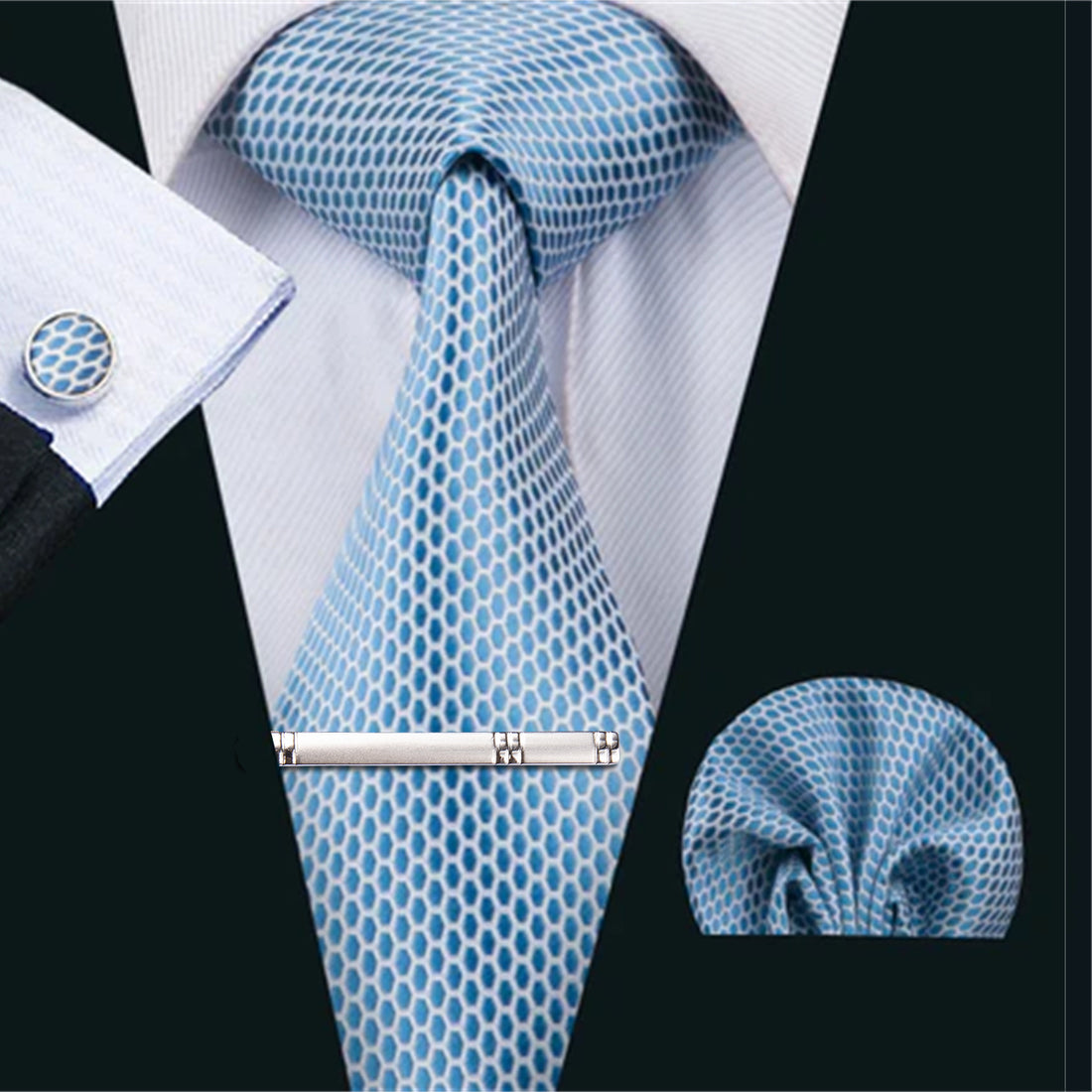 Shining SkyBlue Geometric Tie Pocket Square Cufflinks Clip Set