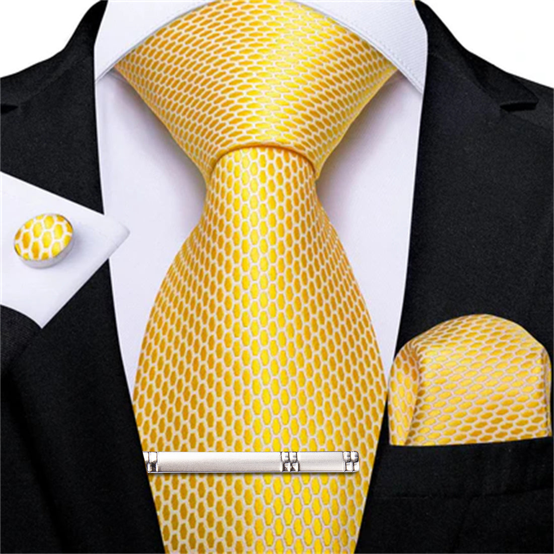 Shining Yellow Geometric Tie Pocket Square Cufflinks Clip Set