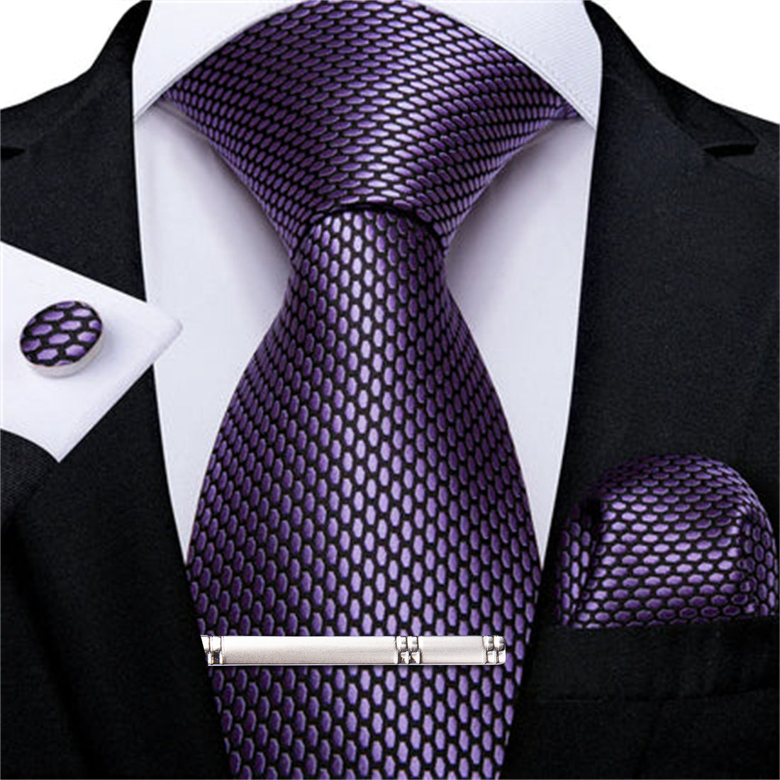 Shining Purple Geometric Tie Pocket Square Cufflinks Clip Set