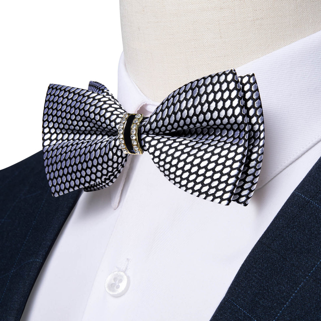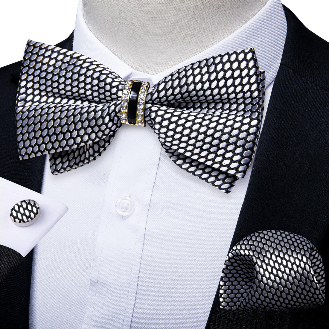 DiBanGu Black Tie Grey Geometric Men's Pre-Bow Tie Hanky Cufflinks Set