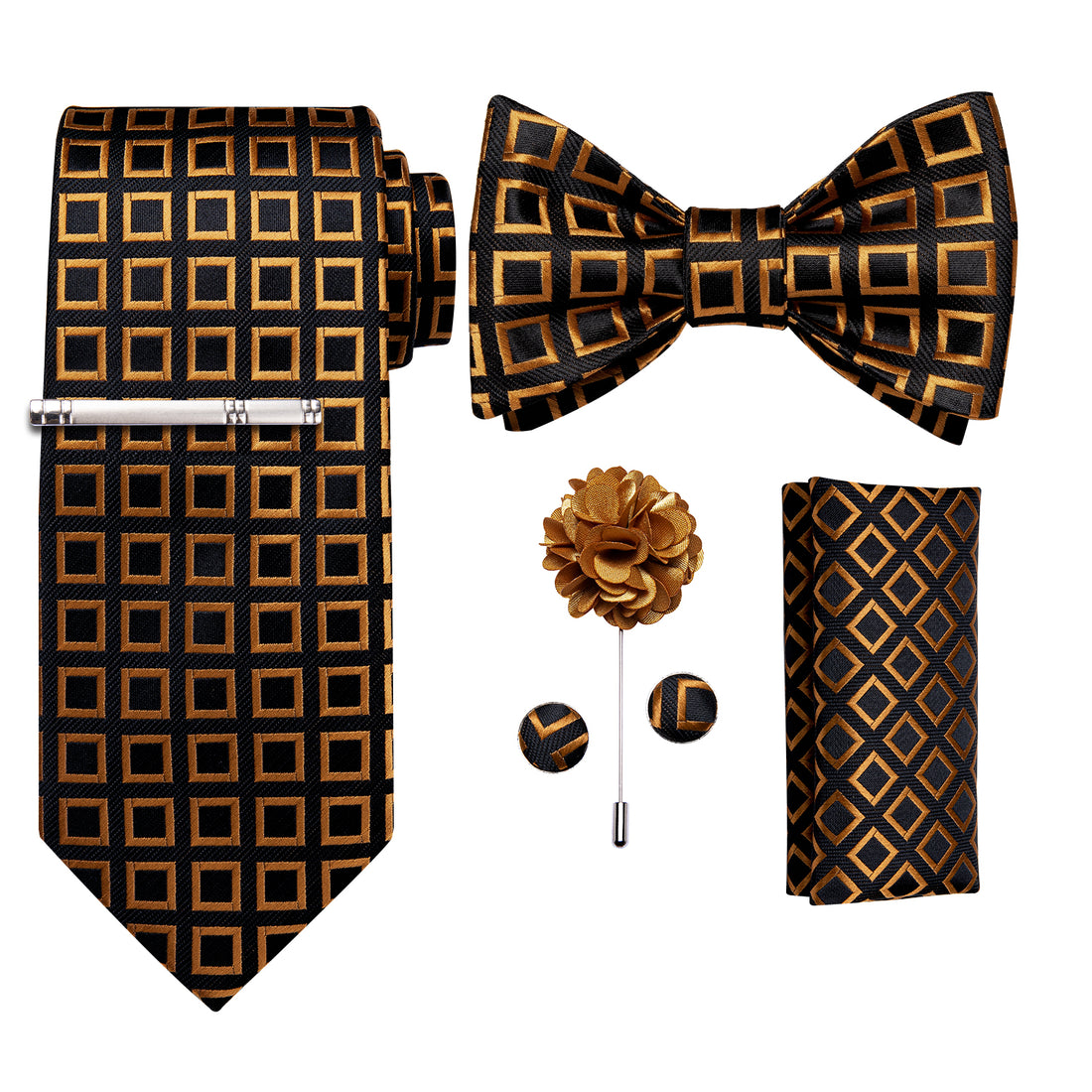 Black Brown Geometric Bowtie Necktie Hanky Cufflinks Brooch Clip Set
