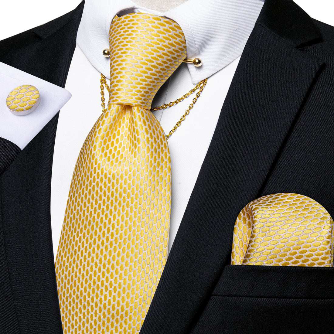 Shining Yellow Geometric Tie Pocket Square Cufflinks Set with Collar Pin