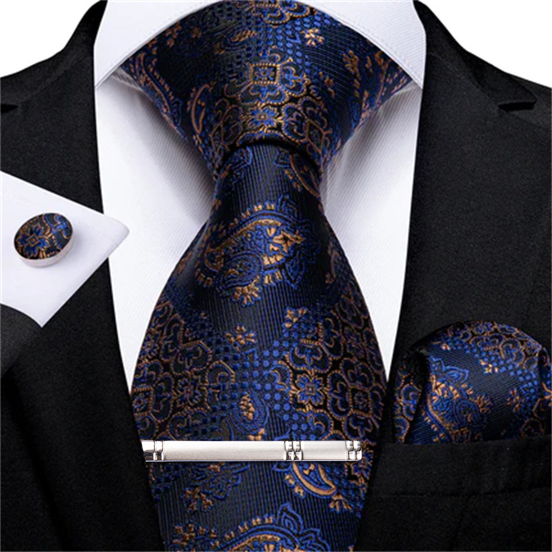 Dark Blue Gold Plaid Floral Tie Pocket Square Cufflinks Clip Set