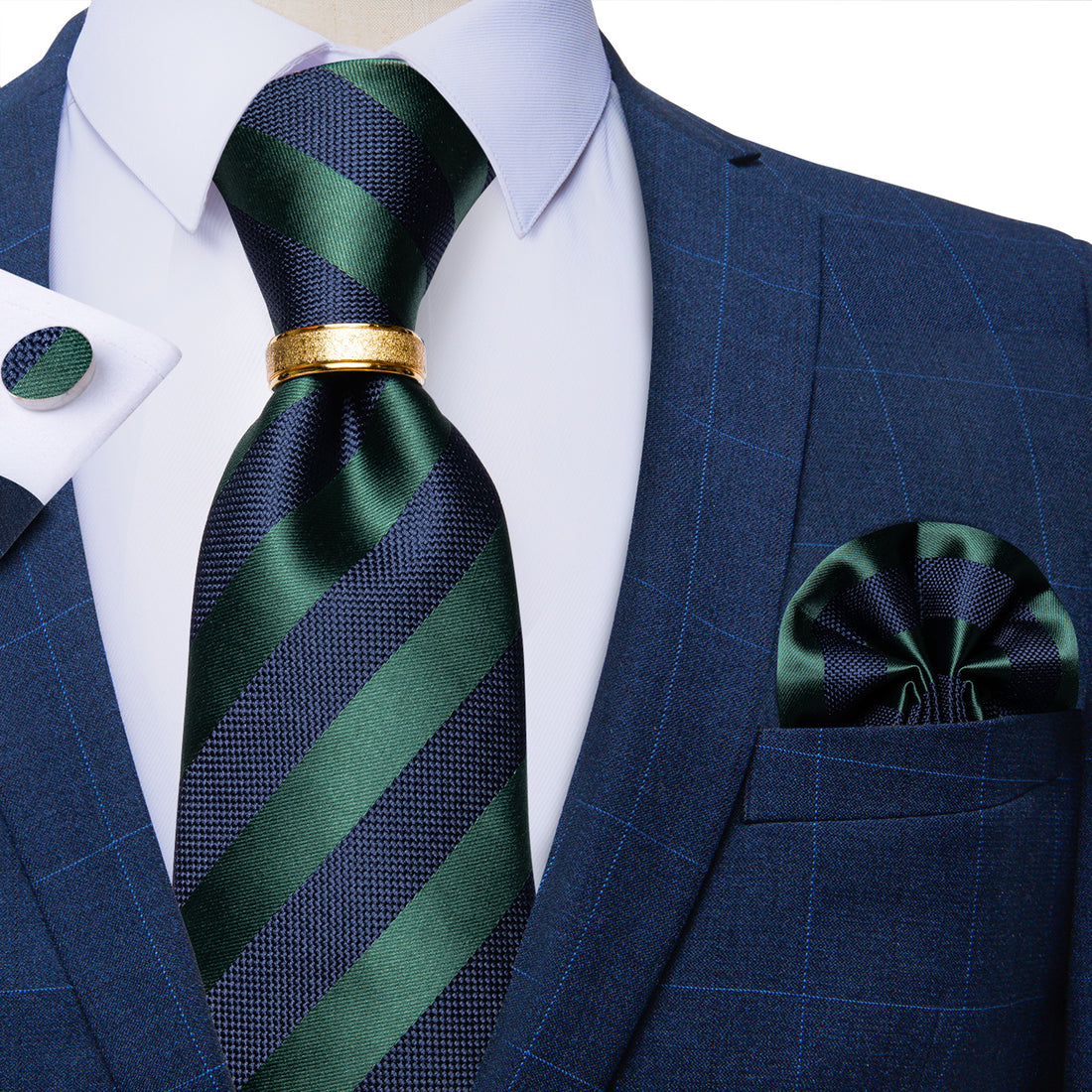 4PCS Blue Green Stripe Silk Men's Tie Pocket Square Cufflinks with Tie Ring Set