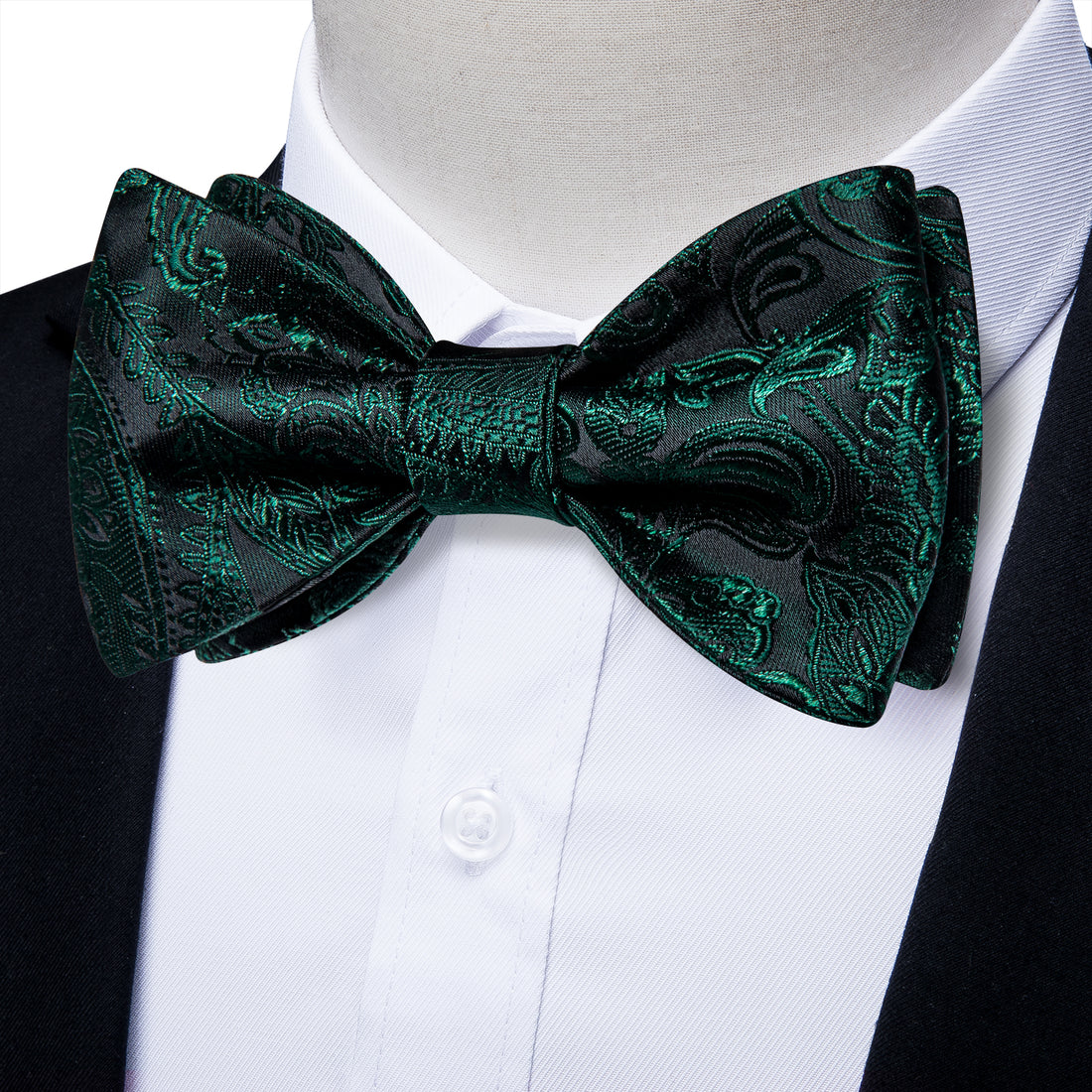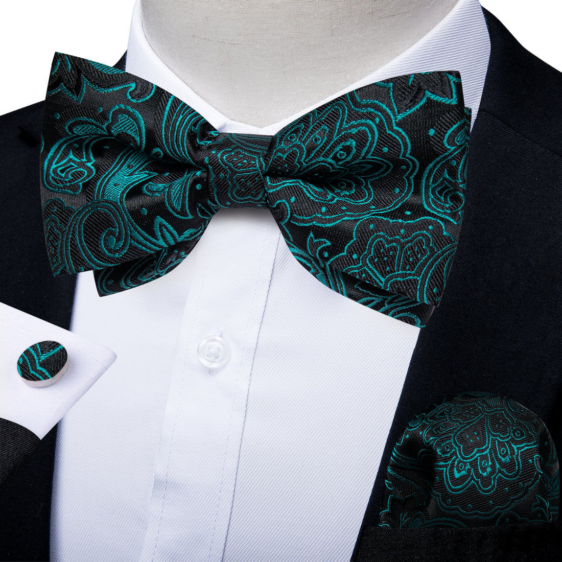 Black Teal Floral Silk Men's Pre-Bowtie Pocket Square Cufflinks Set