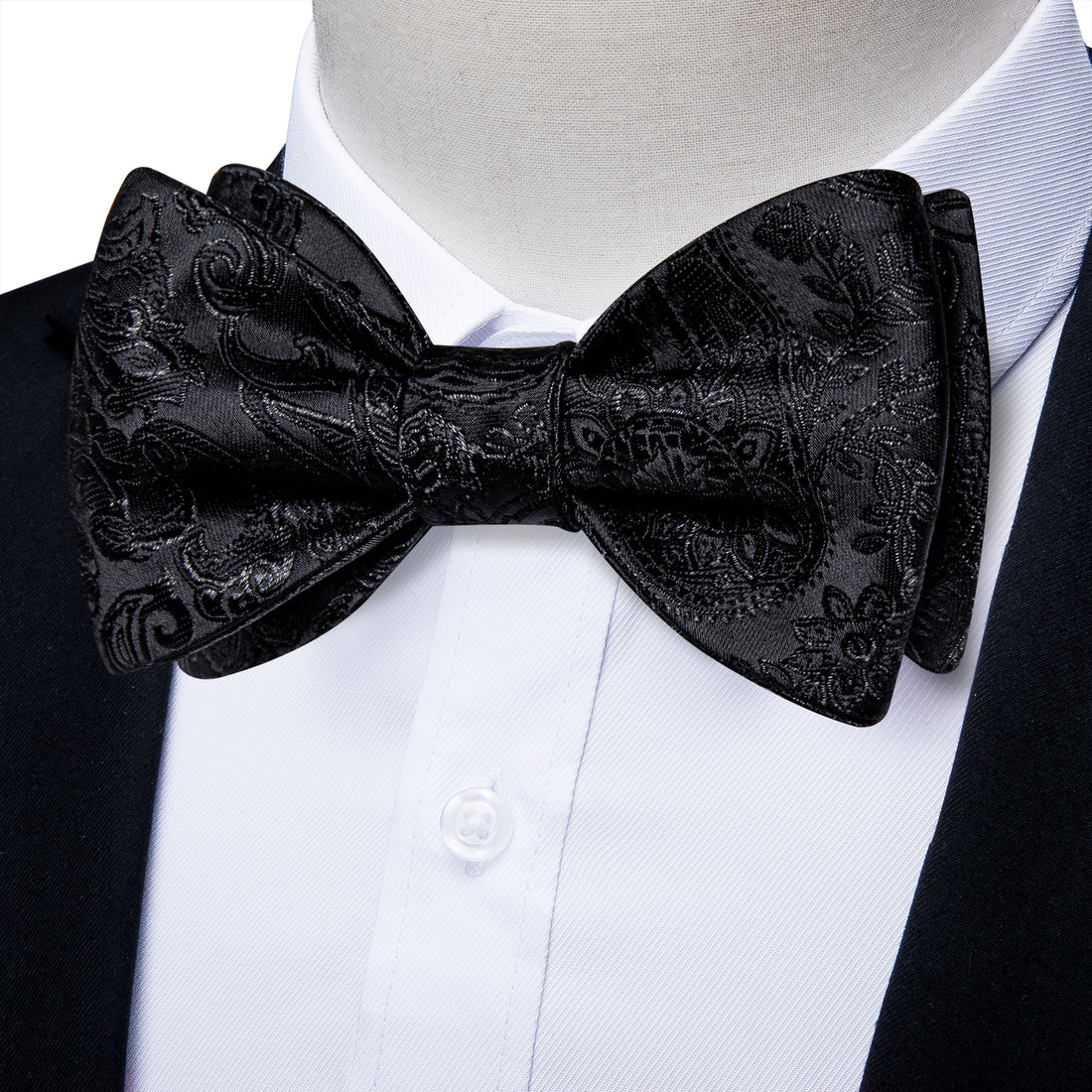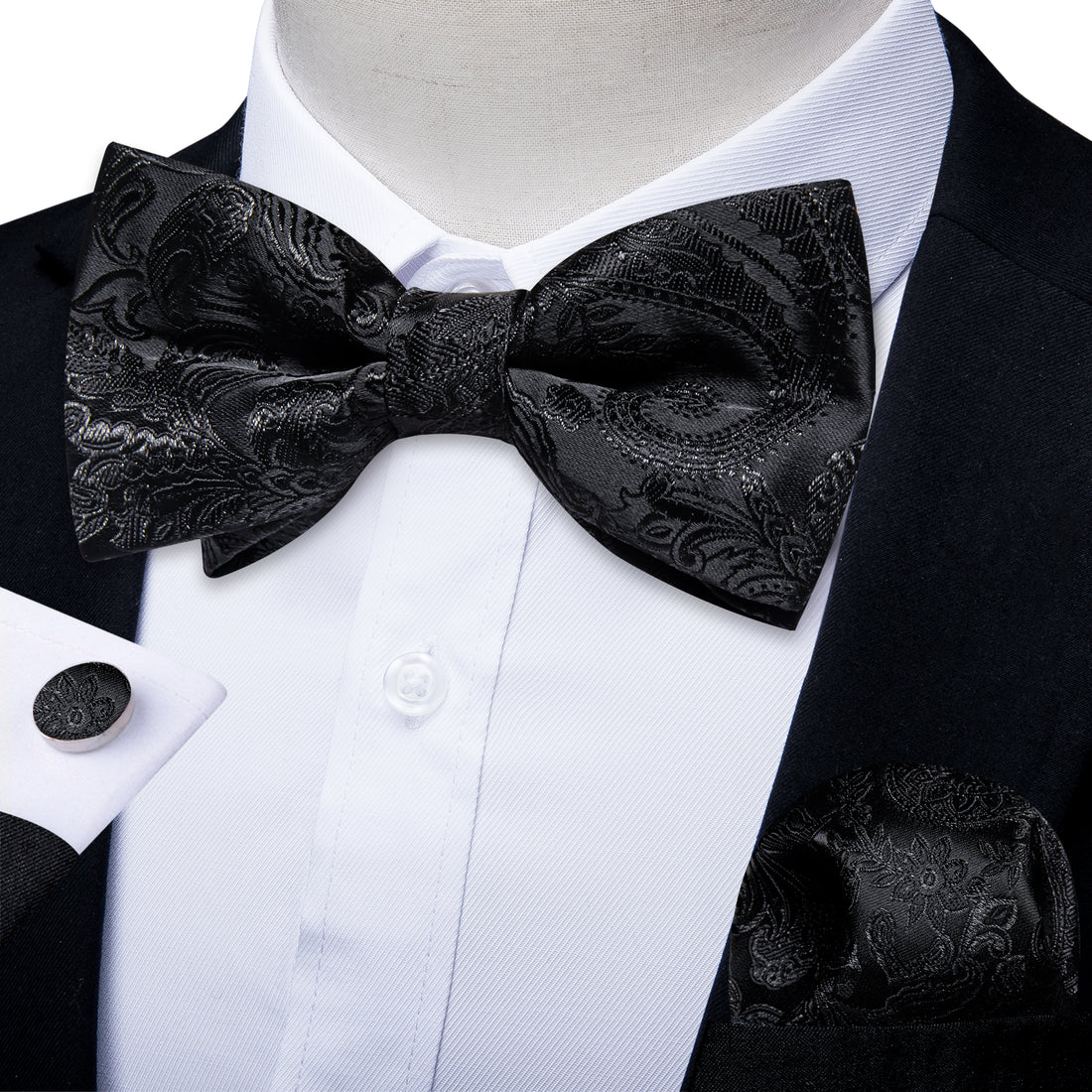 Black Floral Self-Bowtie Pocket Square Cufflinks Set
