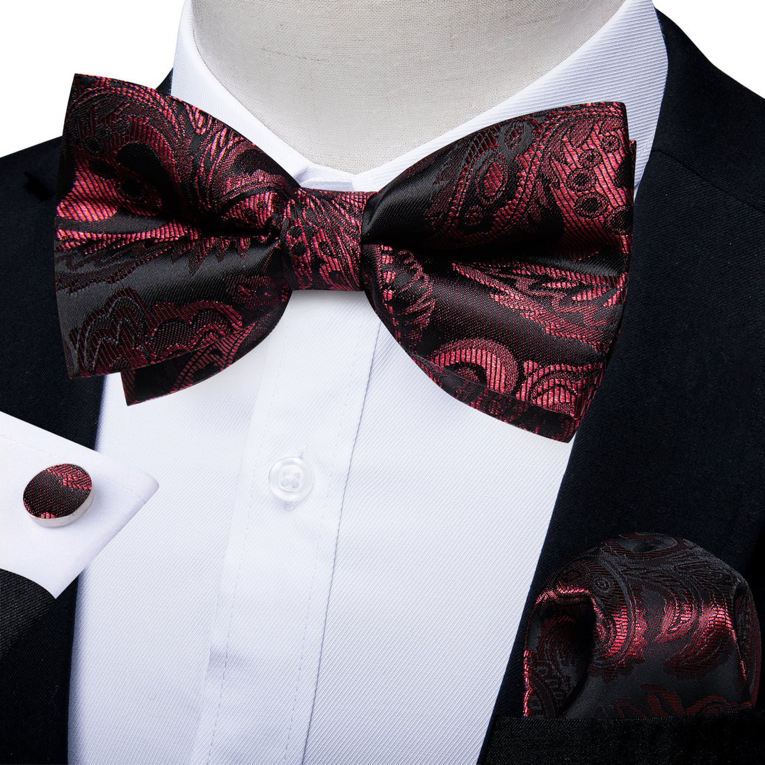 Black Red Floral Self-Bowtie Pocket Square Cufflinks Set