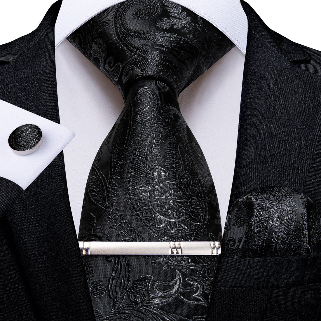 Black Floral Men's Tie Handkerchief Cufflinks Clip Set