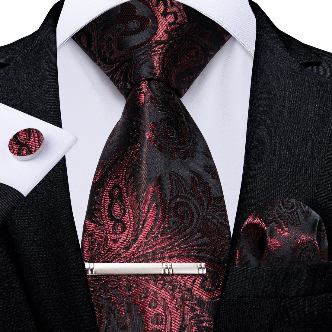 Black Claret Floral Men's Tie Handkerchief Cufflinks Clip Set