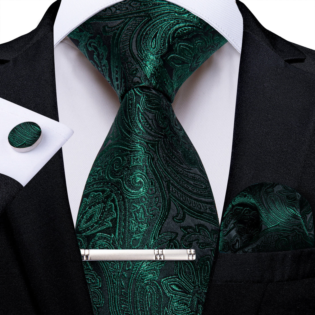 Black Green Floral Men's Tie Handkerchief Cufflinks Clip Set