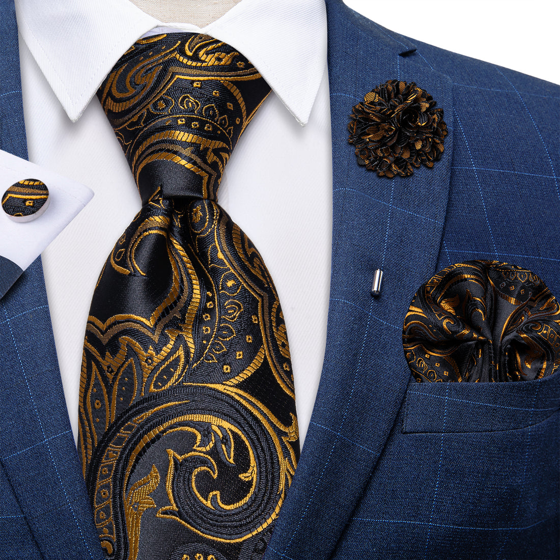 Black Golden Floral Silk Men's Necktie Handkerchief Cufflinks Set With Lapel Pin Brooch Set