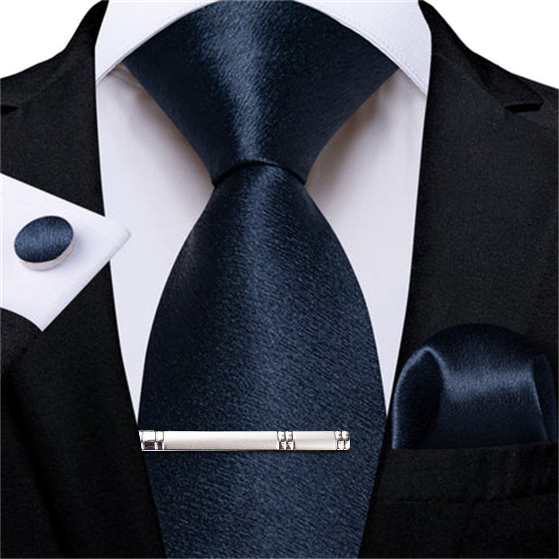 DiBanGu Silk Tie Shining Navy Blue Solid Mens Formal Dress Tie Handkerchief Cufflinks Clip Set