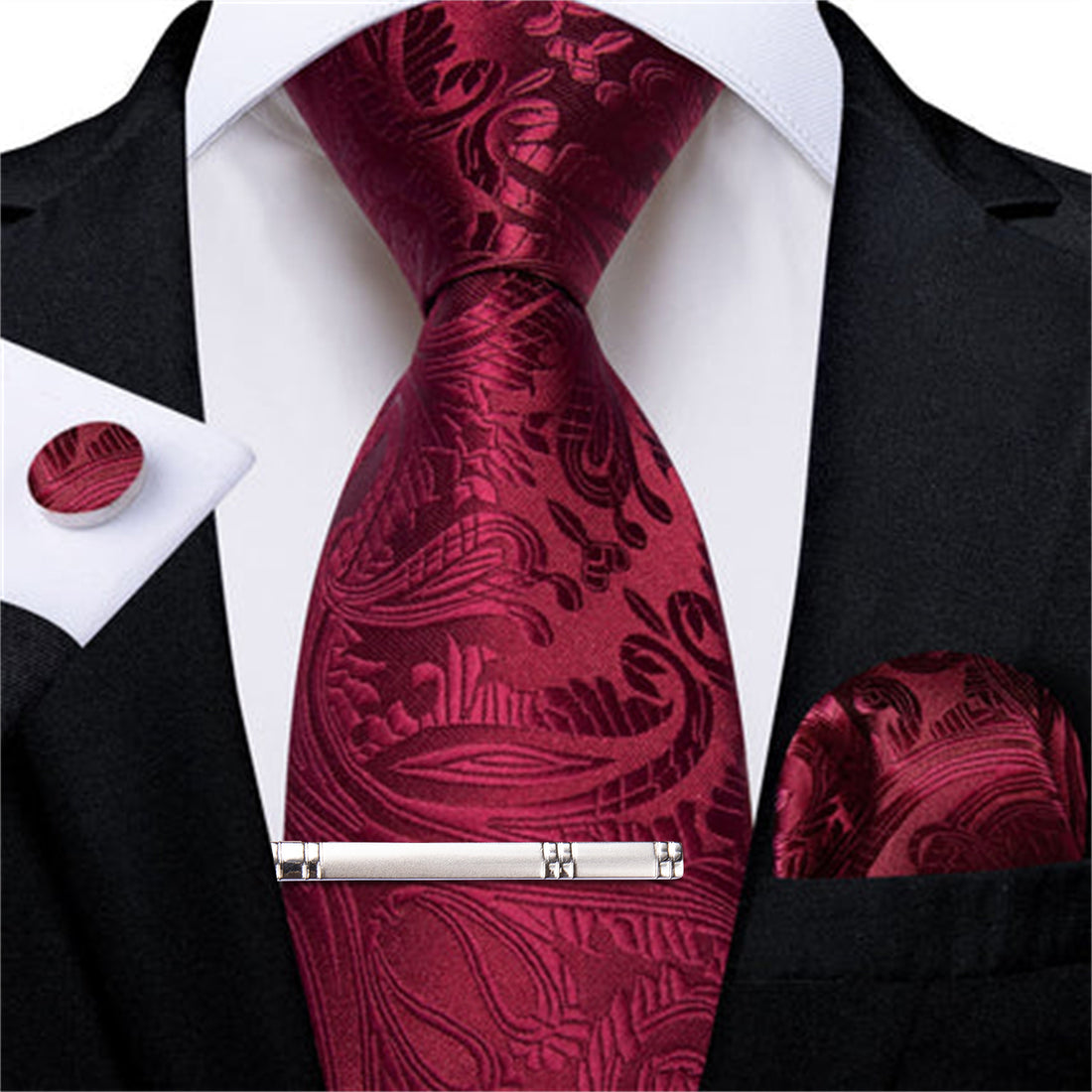 DiBanGu Dress Tie Burgundy Paisley Silk Men's Tie Pocket Square Cufflinks Clip Set