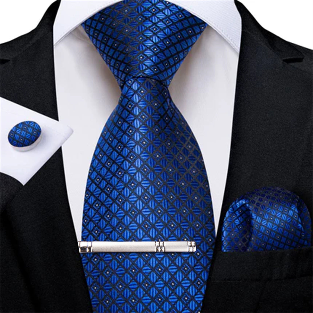 DiBanGu Dress Tie Navy Blue Plaid Men's Silk Tie Pocket Square Cufflinks Clip Set