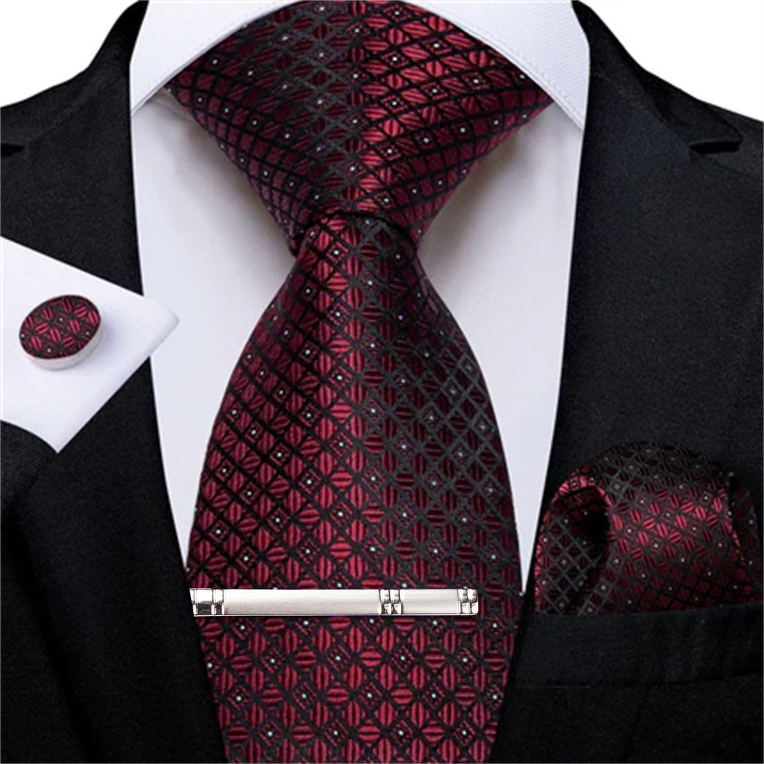 DiBanGu Dress Tie Burgundy Plaid Men's Silk Tie Pocket Square Cufflinks Clip Set