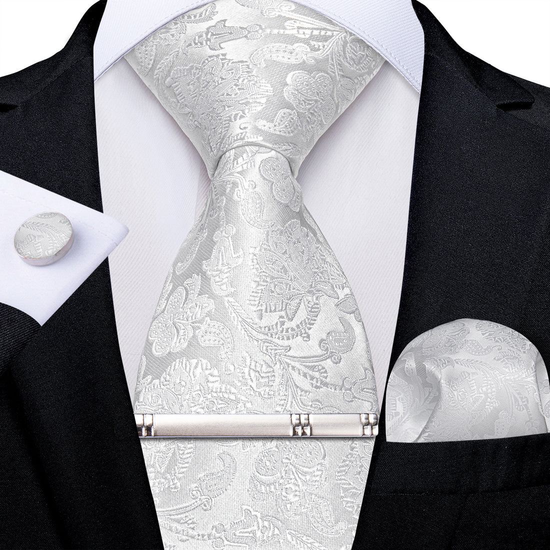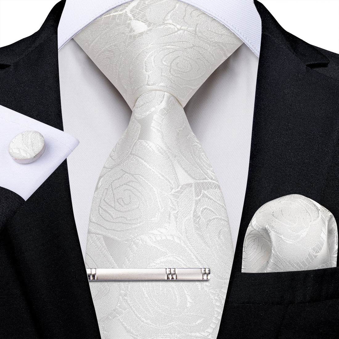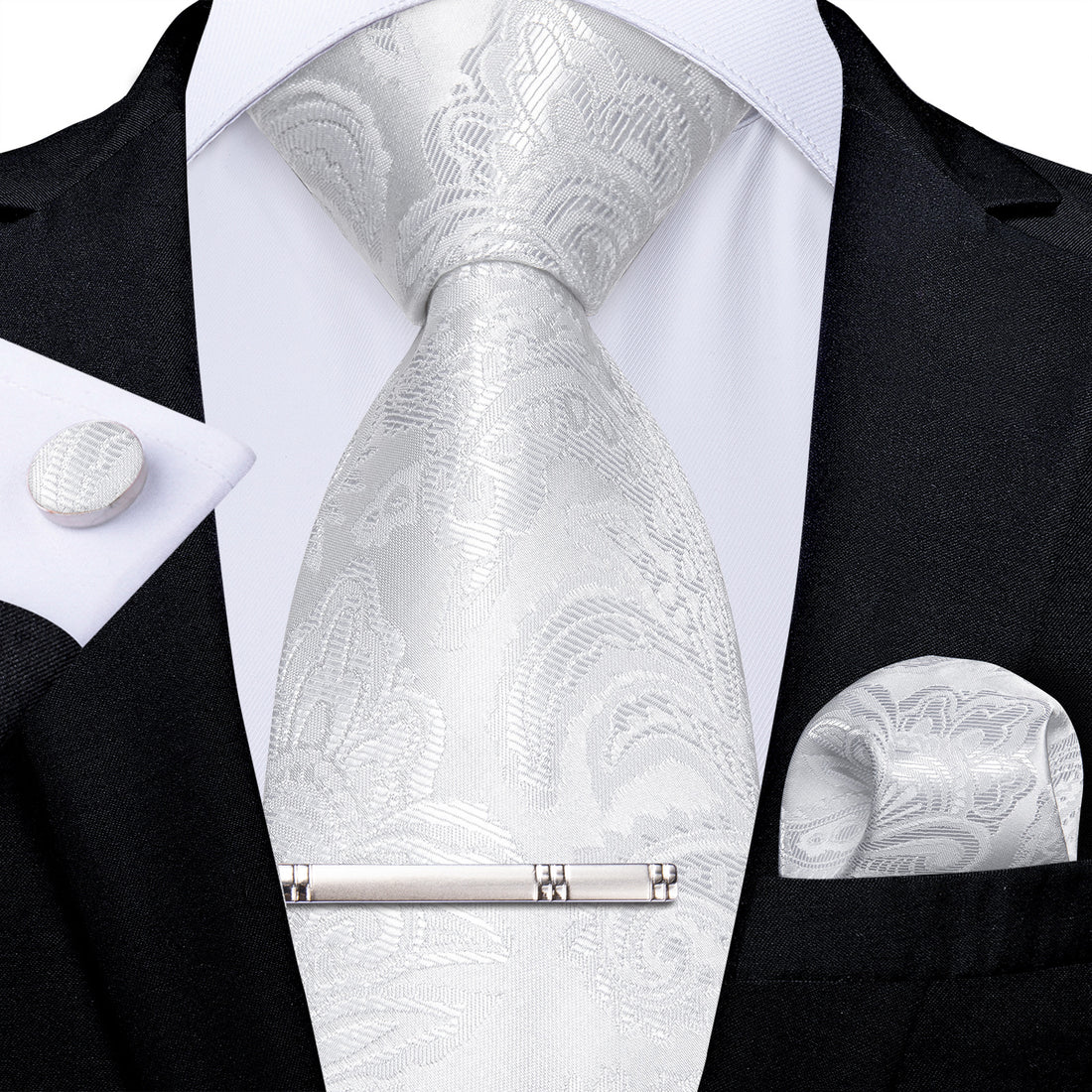 White Floral Men's Tie Handkerchief Cufflinks Clip Set