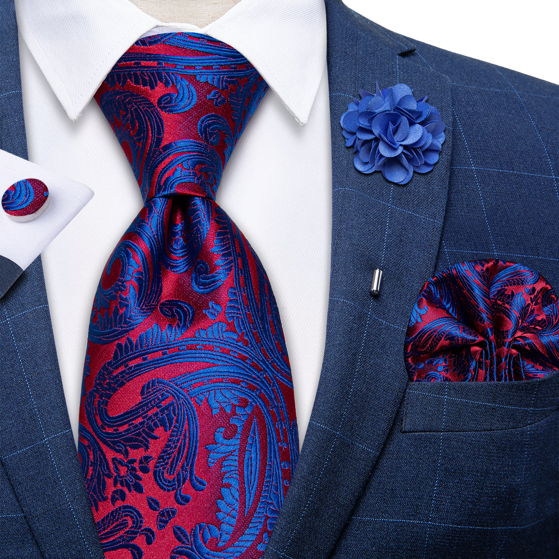 Red Blue Floral Silk Men's Necktie Handkerchief Cufflinks Set With Lapel Pin Brooch Set
