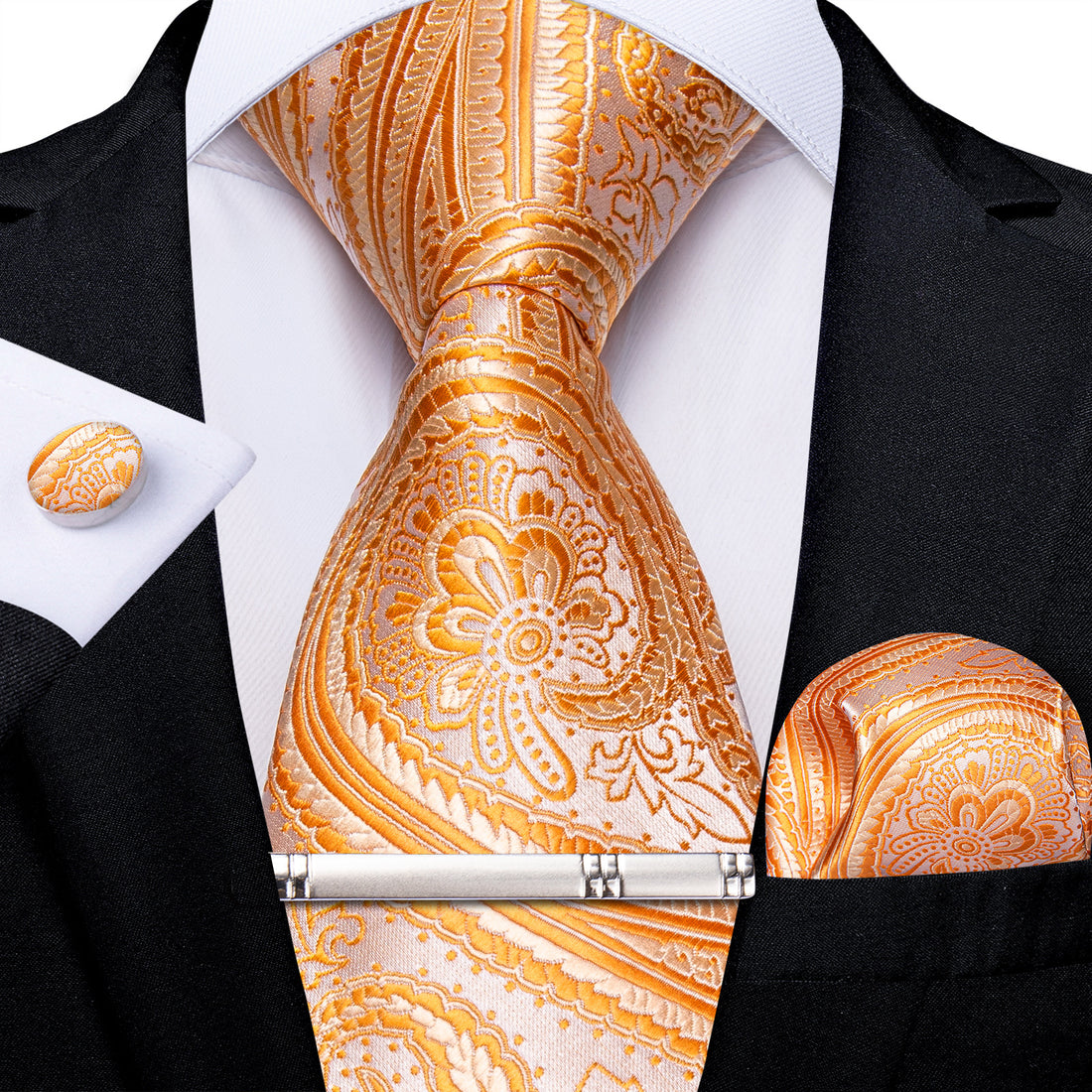 Orange Paisley Men's Tie Handkerchief Cufflinks Clip Set