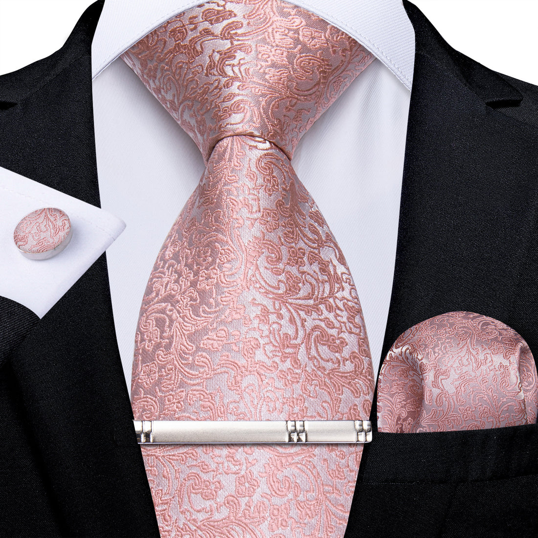 Pink Floral Men's Tie Handkerchief Cufflinks Clip Set