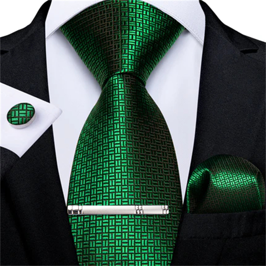 Green Solid Men's Tie Handkerchief Cufflinks Clip Set