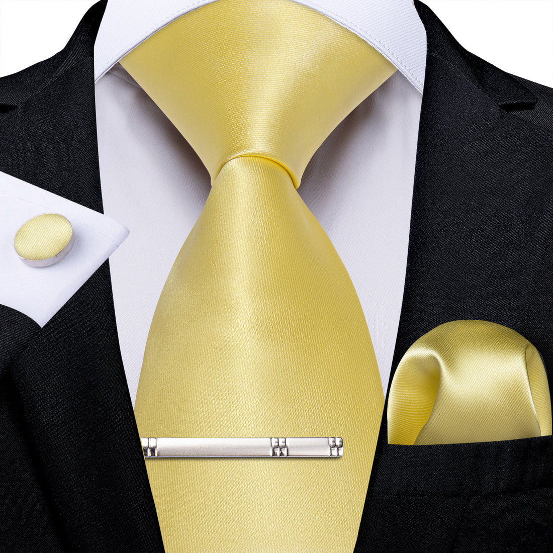 Light Yellow Solid Men's Tie Handkerchief Cufflinks Clip Set