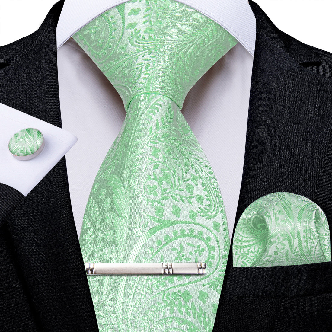 Mint Green Floral Men's Tie Handkerchief Cufflinks Clip Set