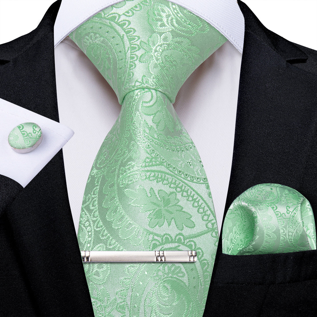 Green Paisley Men's Tie Handkerchief Cufflinks Clip Set