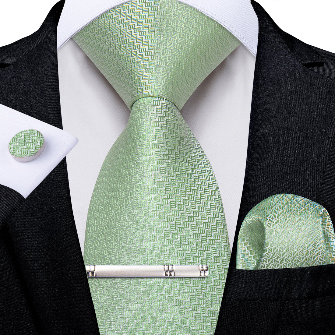 Green Solid Men's Tie Pocket Square Cufflinks Clip Set