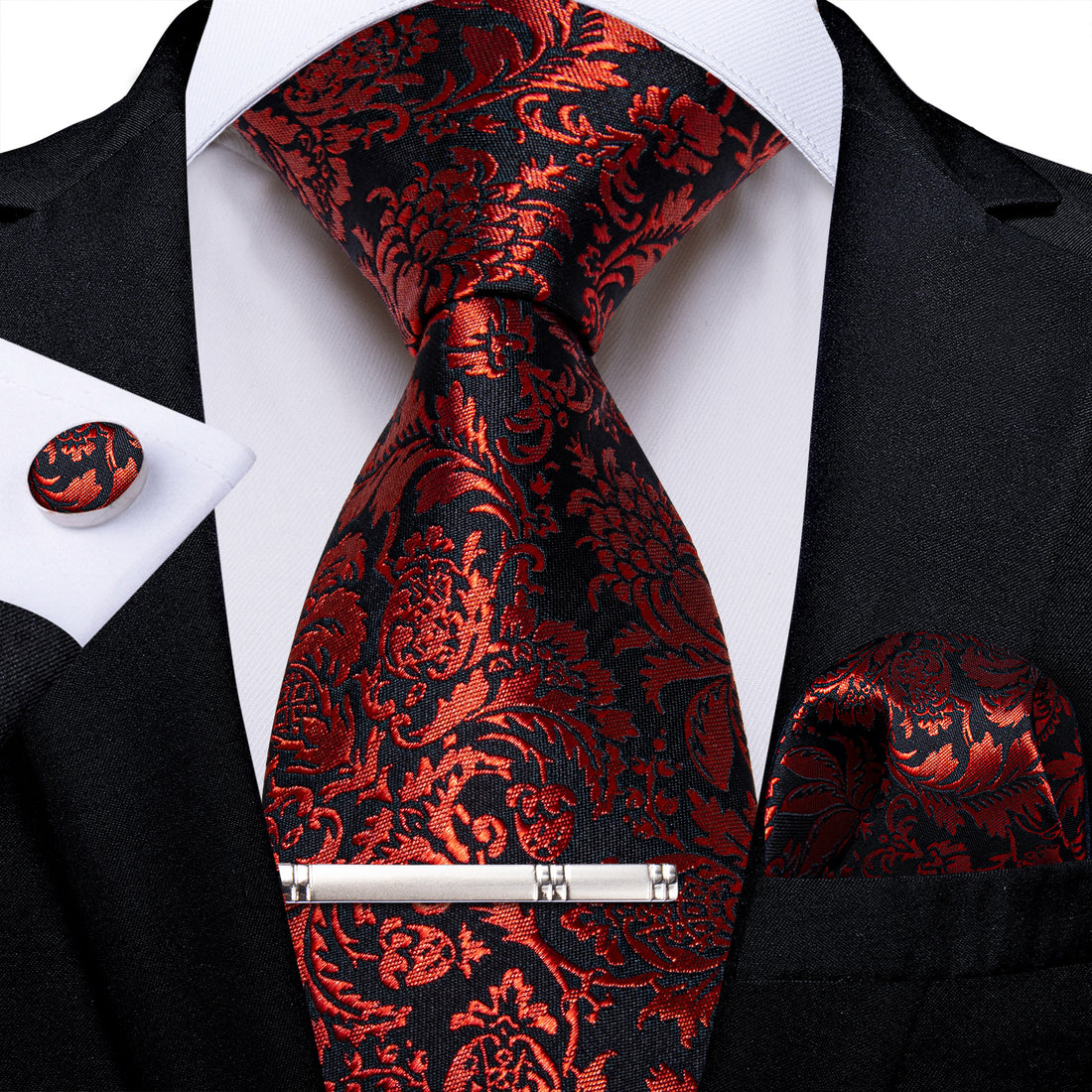 Black Red Floral Men's Tie Handkerchief Cufflinks Clip Set